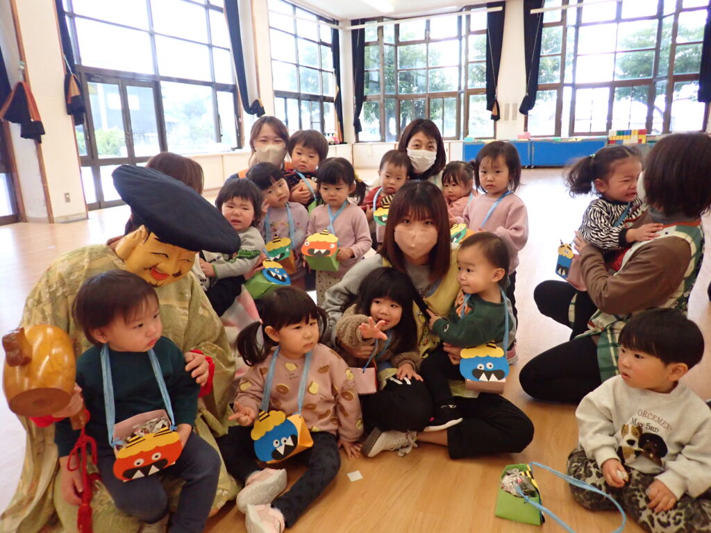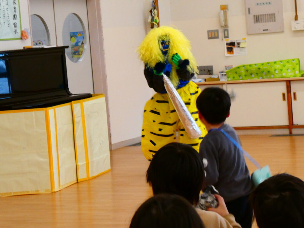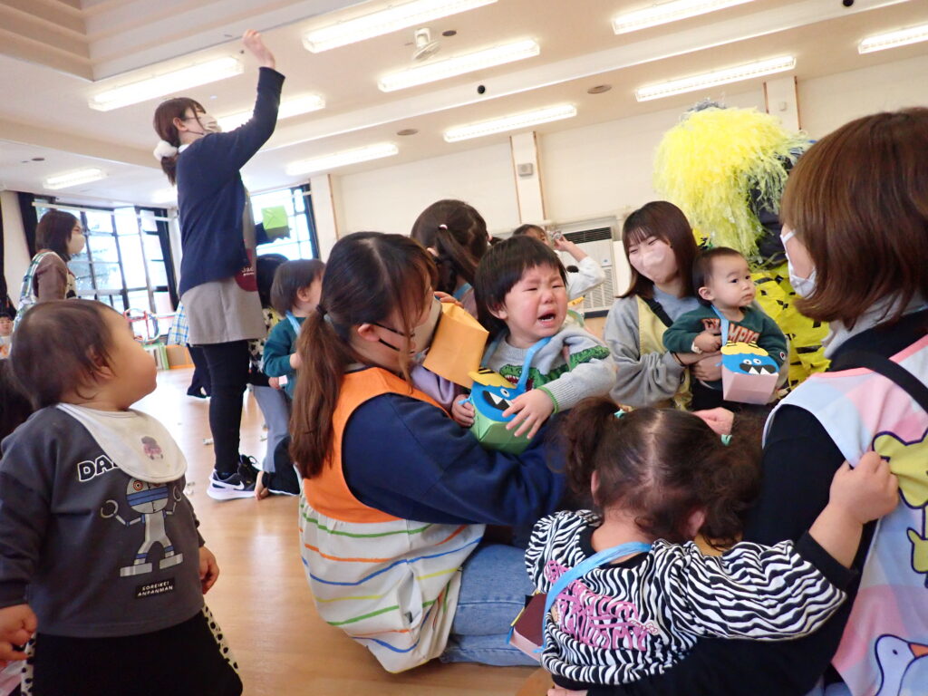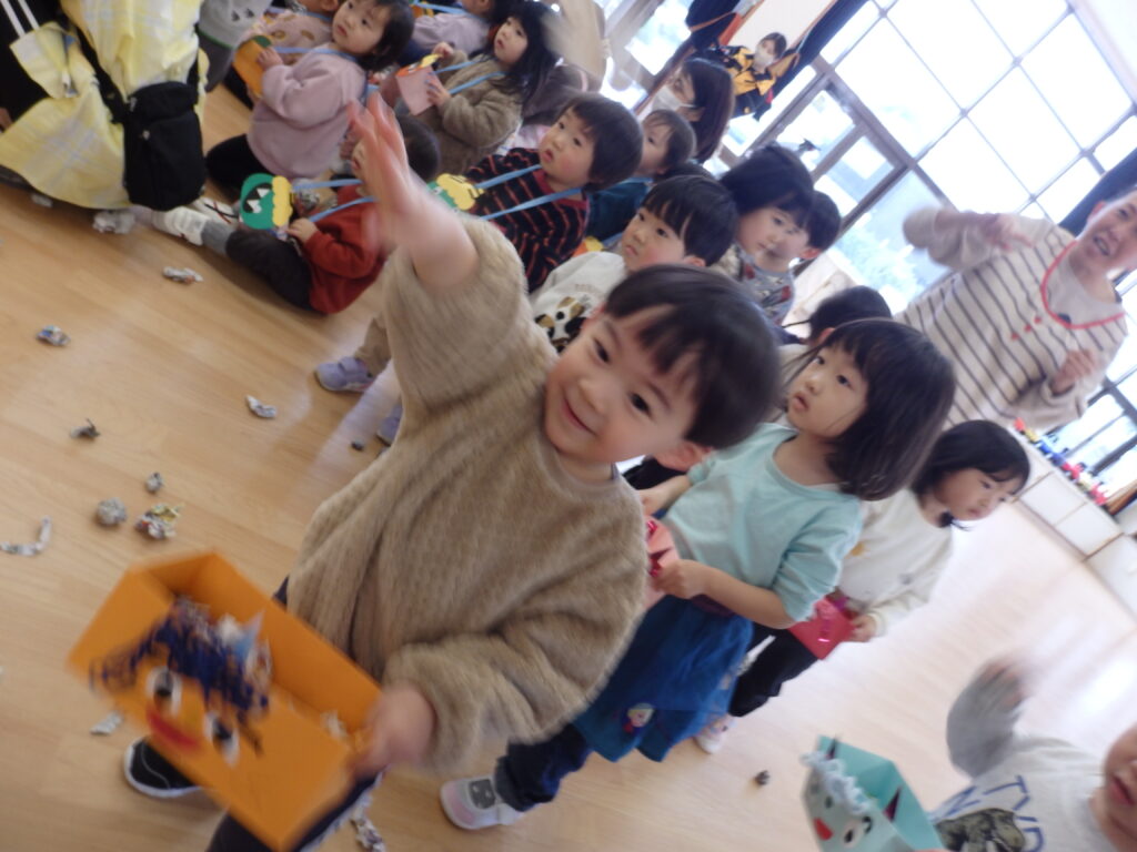 パネルシアターが終わり、みんなで「豆まき」の歌を歌うと扉の向こうから太鼓の音が…。ドキドキしていると青鬼がやって来て、元気いっぱい豆まきが始まりました。しばらくすると青鬼がいじめられていることを聞きつけた赤鬼が登場!鬼の迫力に涙が出るお友だちもいましたが、みんなで力を合わせて「おにはそと、ふくはうち!」の掛け声で豆まきをしていました。