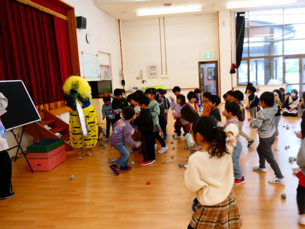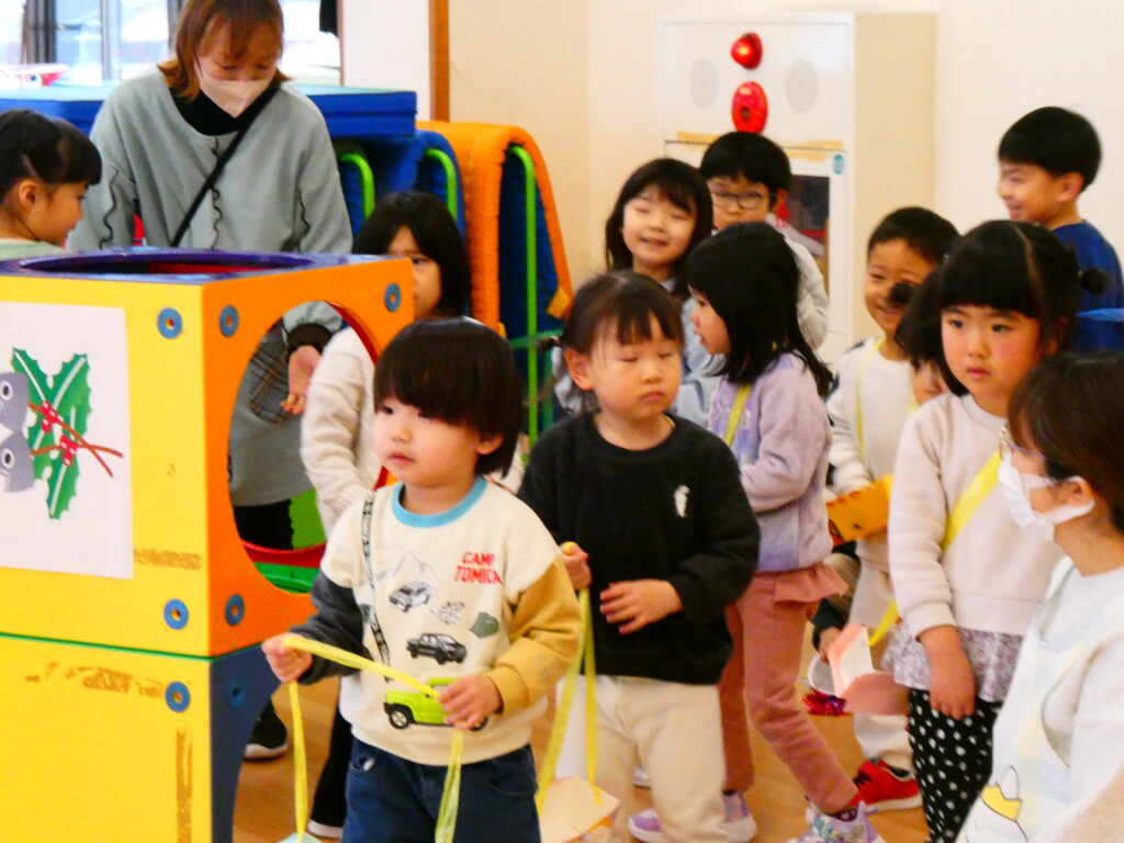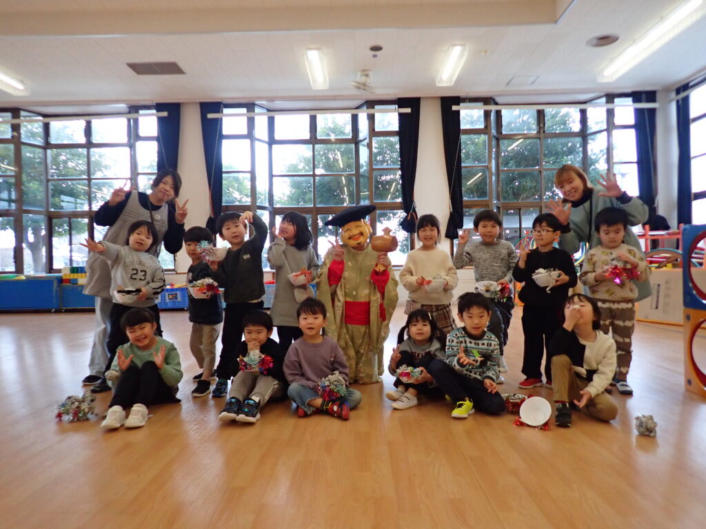 最後には鬼の嫌いな魚クイズをしました。「マグロ」と「イワシ」の2択にするとどっちだったかな~?と迷うお友だちもいましたが、鬼はイワシの頭にトゲトゲのヒイラギの葉っぱがついた「柊鰯(ひいらぎいわし)」が嫌いだと知ることができました。