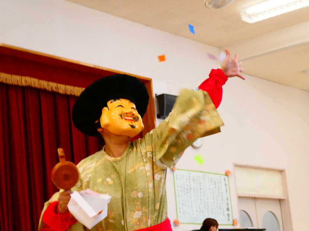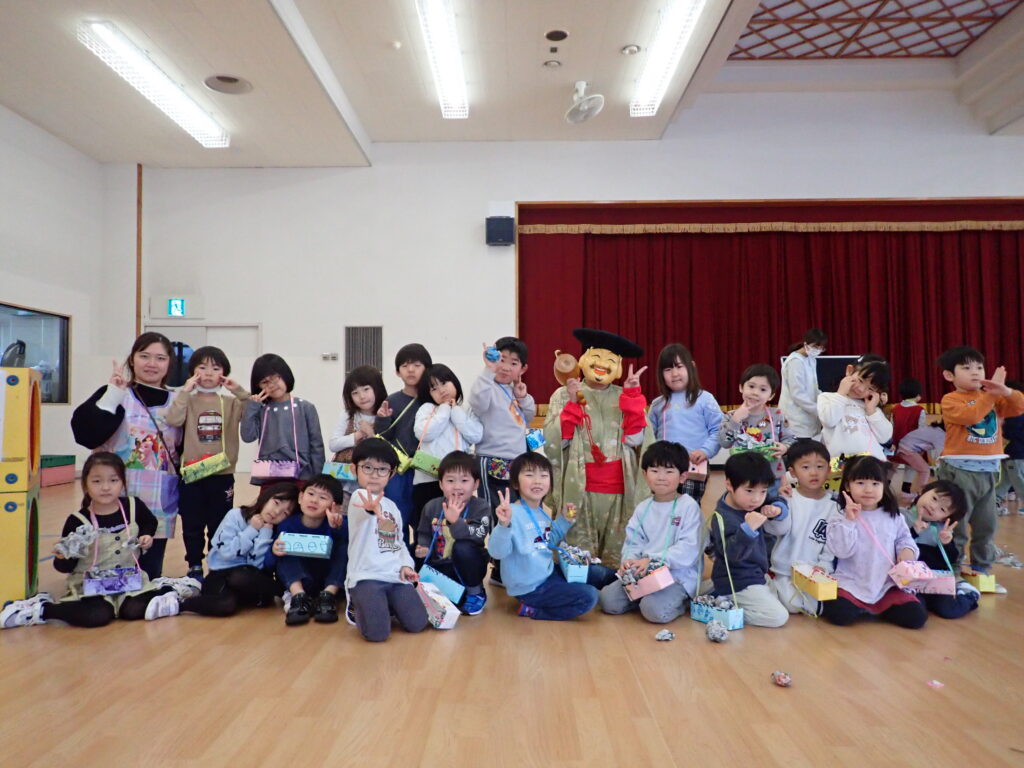 鬼さんが帰るとまたまた、扉の向こうから音が聞こえてきます。今度は鬼!ではなく…福の神が遊びに来てくれました。せっかくなので、福の神に、みんなの「鬼は外、福は内」の声が聞こえたのかや、どうして保育園に来てくれたのかをインタビューしてみました。すると、保育園のお友だちみんなに嬉しいことや楽しいことがこれから沢山あるように福を届けに来てくれたことを教えてくれました。