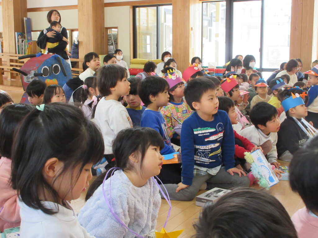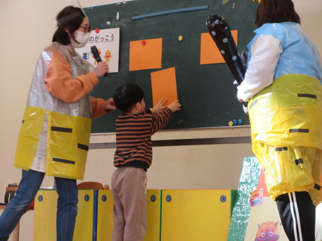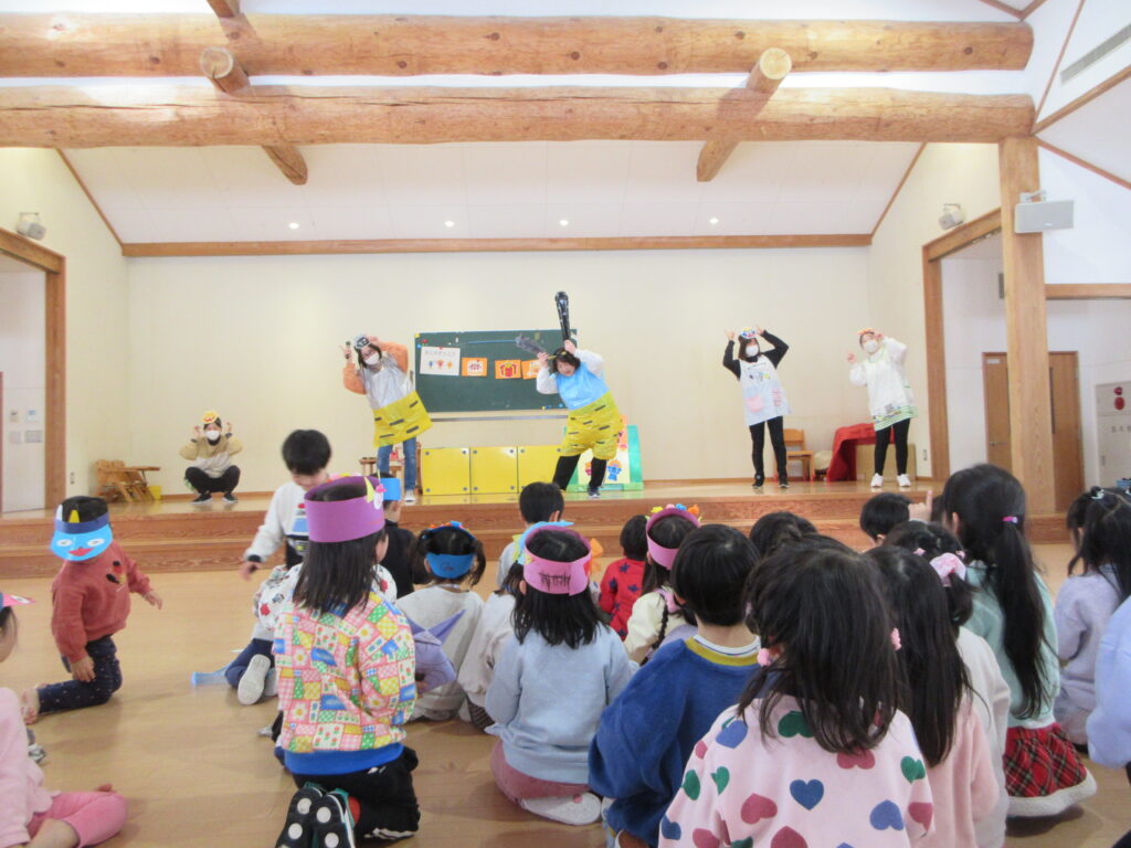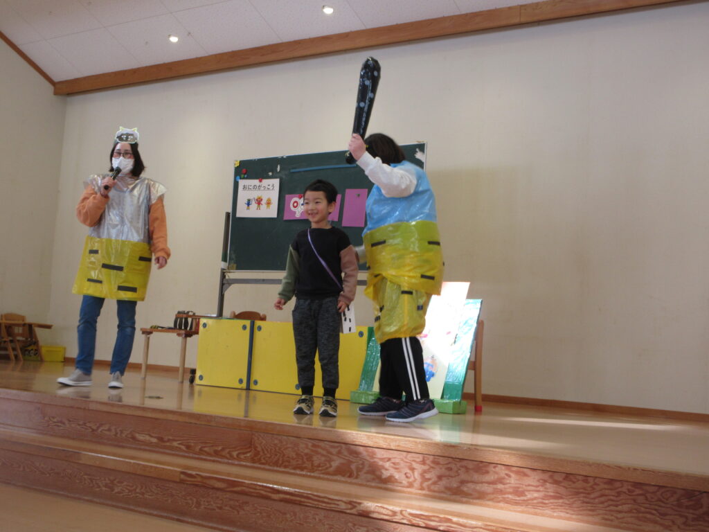 節分の由来では、一人前の鬼になりたい子鬼に、鬼の先生がクイズを出します。子どもたちもクイズに参加しながら、楽しみながら由来を聞いていました。