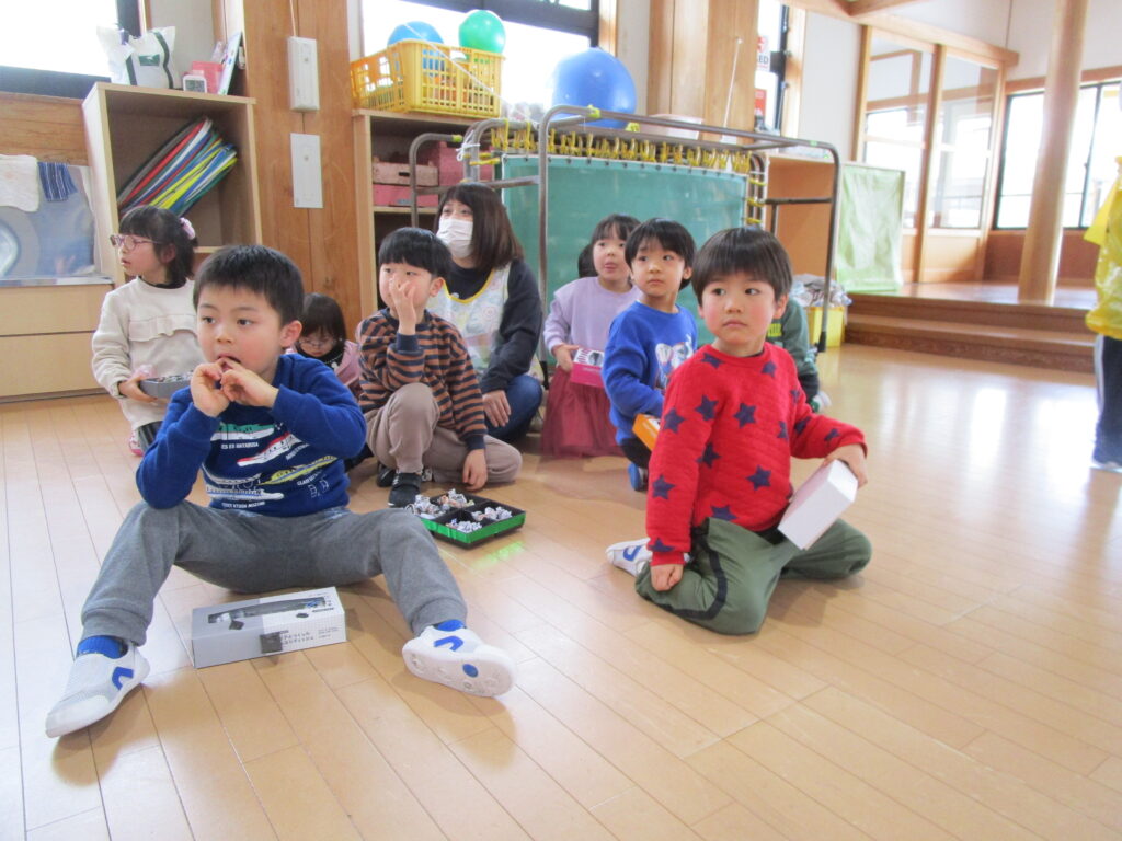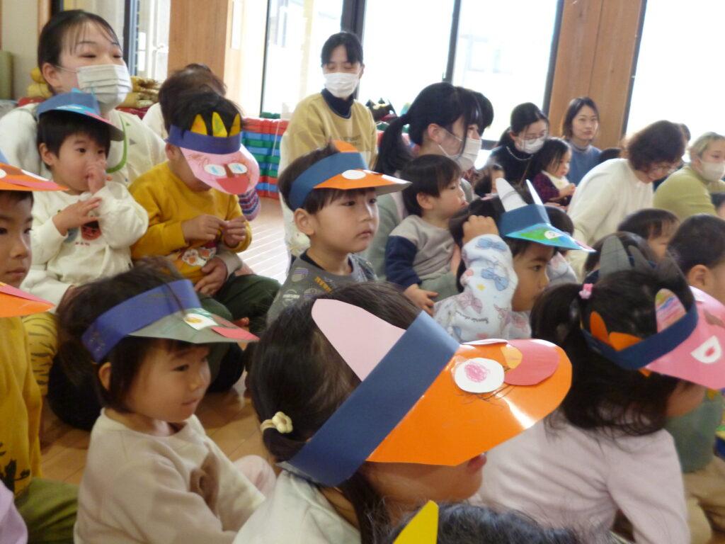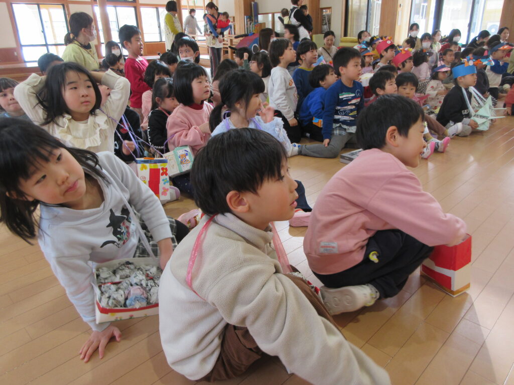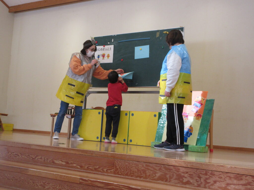 節分の由来では、一人前の鬼になりたい子鬼に、鬼の先生がクイズを出します。子どもたちもクイズに参加しながら、楽しみながら由来を聞いていました。