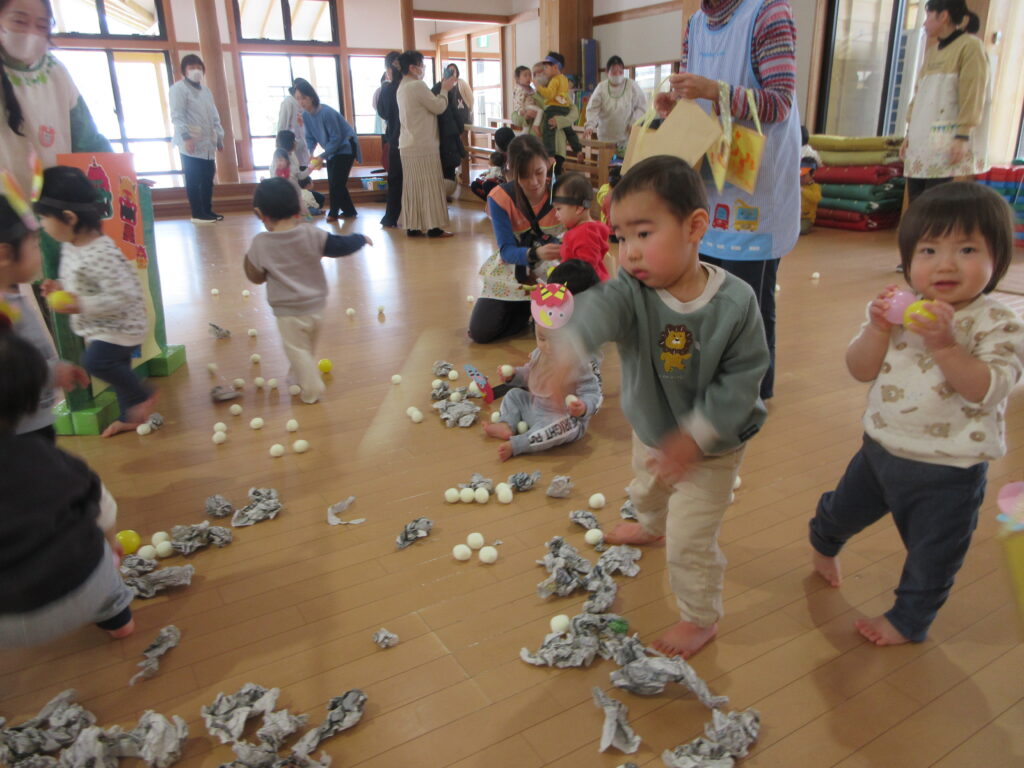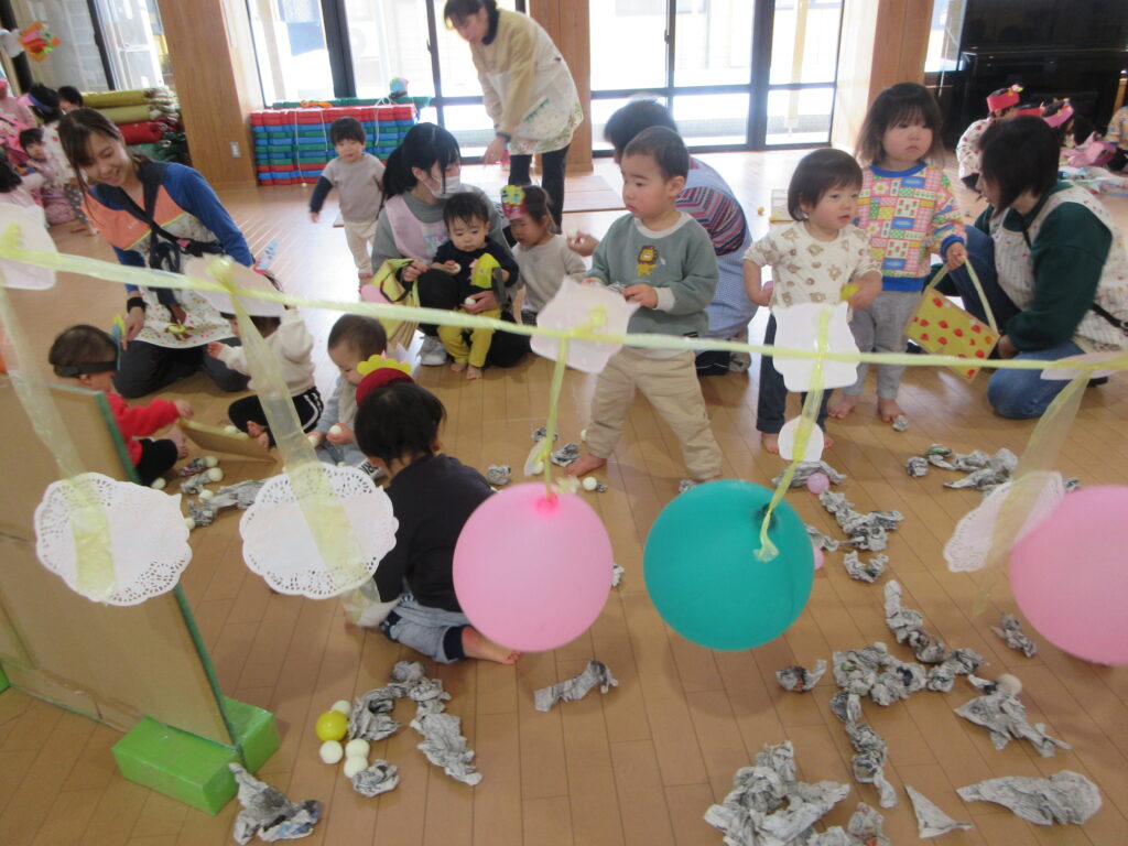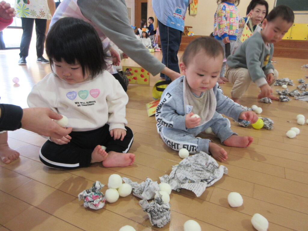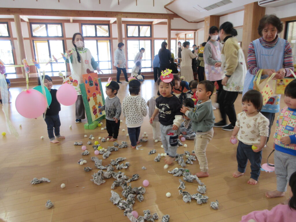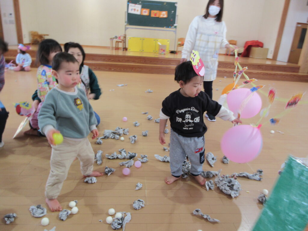 劇の後は、はな組、とり組の豆まきゲーム!鬼の顔がついた風船に豆に見立てた新聞をえい!!と投げて鬼退治。