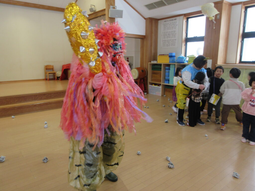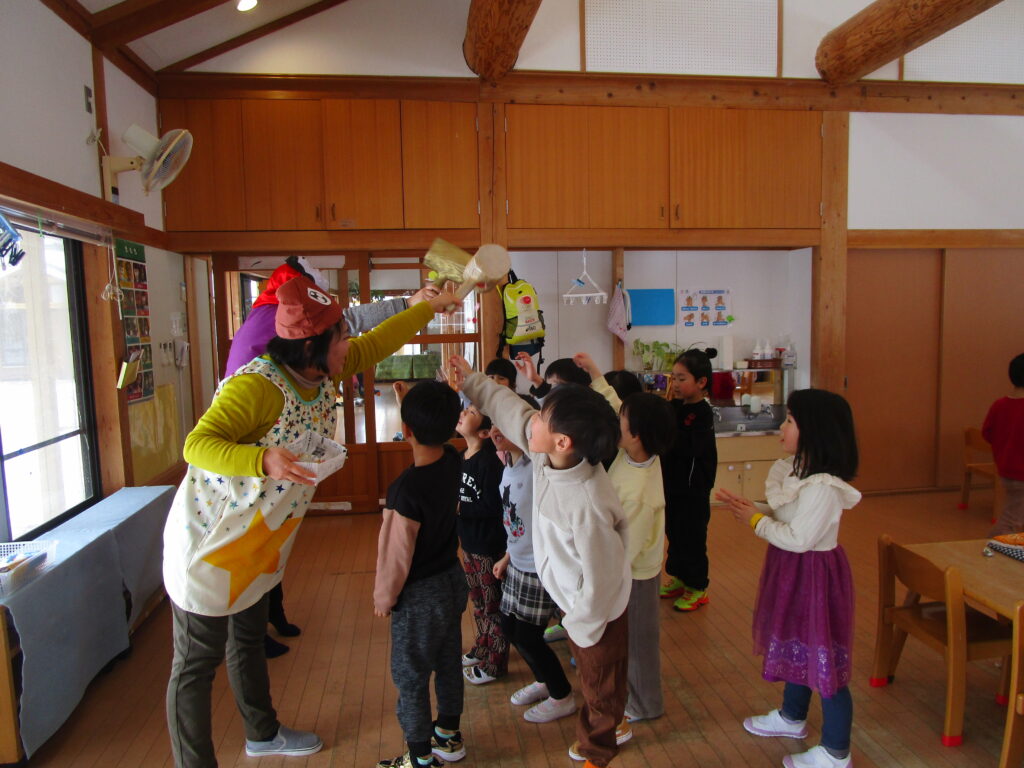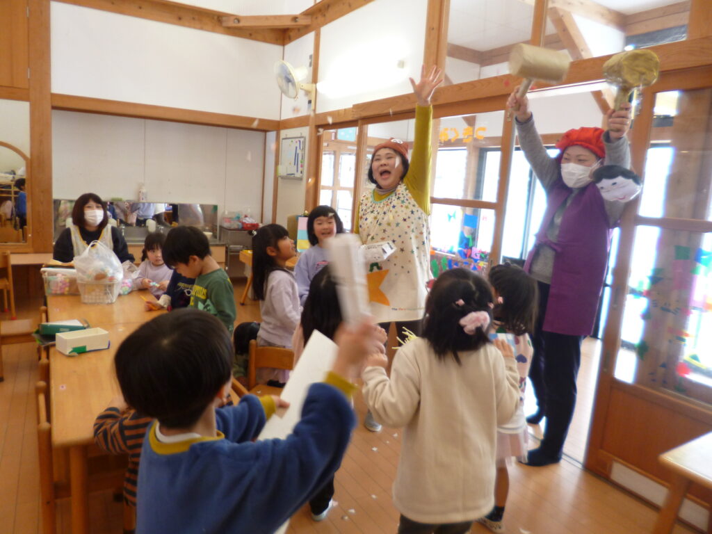 一人前になってしまった鬼が職員を鬼にしてしまいましたが、皆で「まめまき」の歌をうたって、職員をもとに戻すことができました。