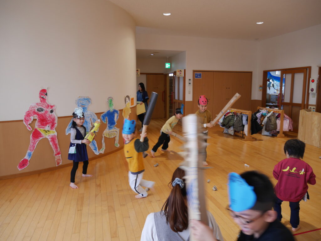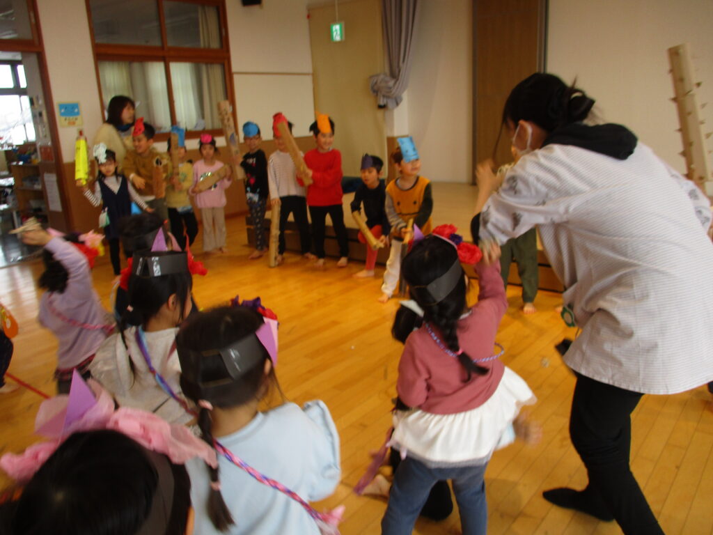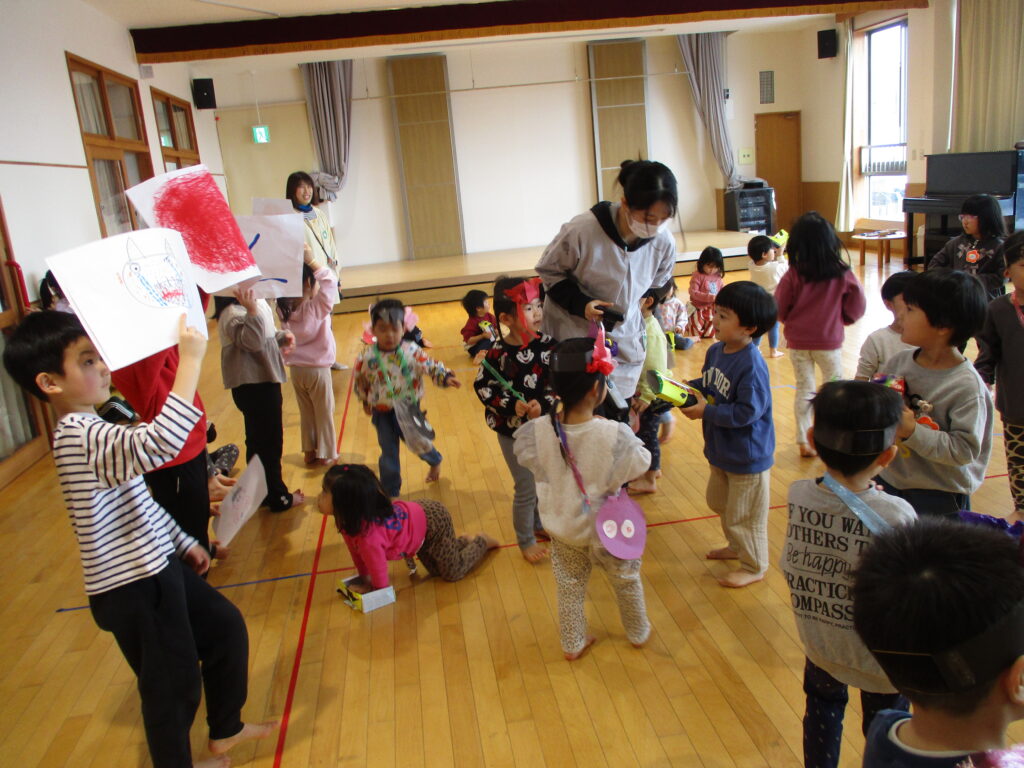 ホールではおひさま組、にじ組、つき組さんが一生懸命おに退治です!