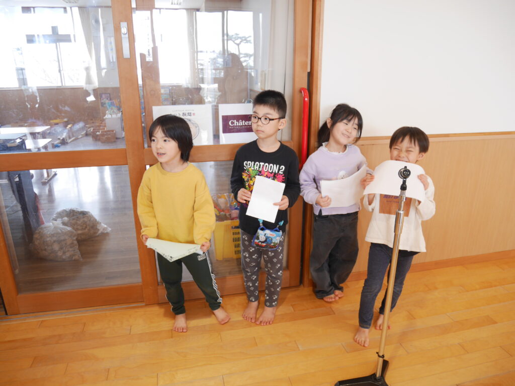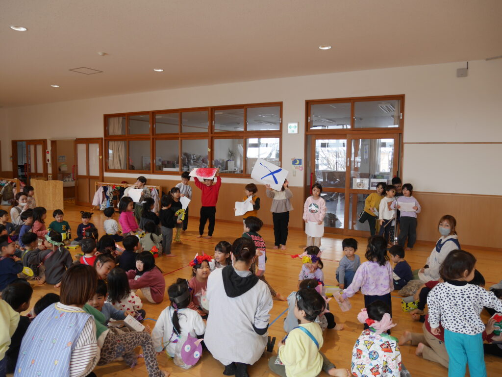 「鬼のツノはとれる!〇か✖か!」「鬼のパンツは虎の毛皮でできている!〇か✖か!」など子どもたちらしい発想のクイズでみんなで楽しんでいました!