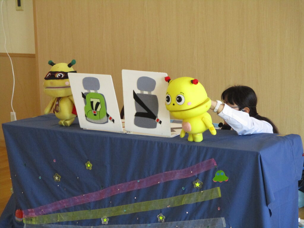 今月の交通安全教室は「ひとまち交流財団」の方が来訪し、3・4・5歳児の子ども達に安全な道路の渡り方やチャイルドシートの必要性等を教えてくれました🚔。最後には道路を渡る練習をし、学びの印にゴールドのカードをもらい嬉しそうな子ども達でした。