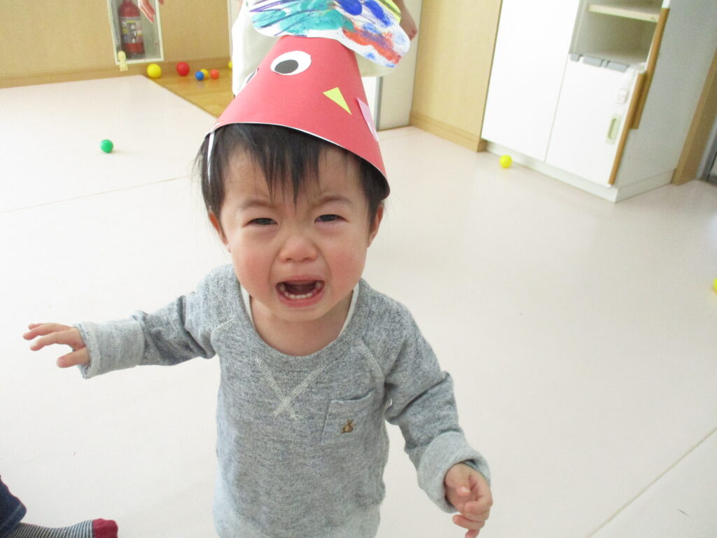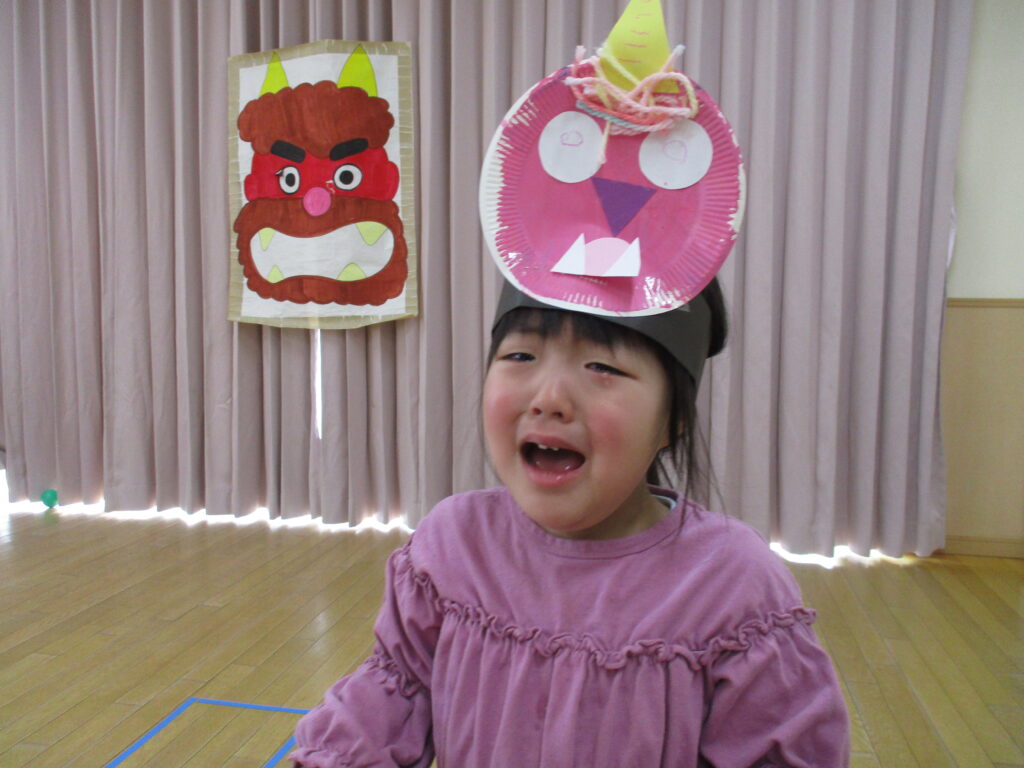 3日は節分で、豆まき会がありました👹。各クラスで作った鬼のお面や帽子を身に付け、0.1.2歳児は保育室で、3.4.5歳児はホールで豆まきを行いました。保育士扮する鬼が登場すると驚きのあまり固まってしまう子、怖くて泣いてしまう子、勇敢に豆まきを行う子と反応は様々でした。給食では”鬼バーグ”を食べ、鬼退治をした子ども達です。みんなの心の鬼は無事に退治できたのでしょうか?