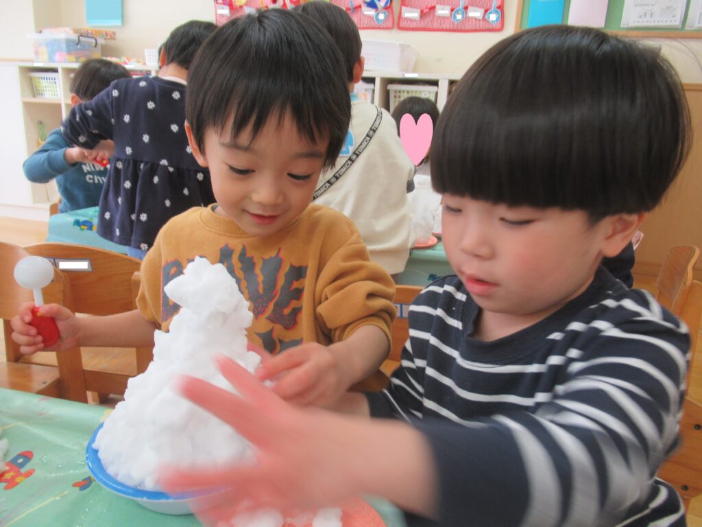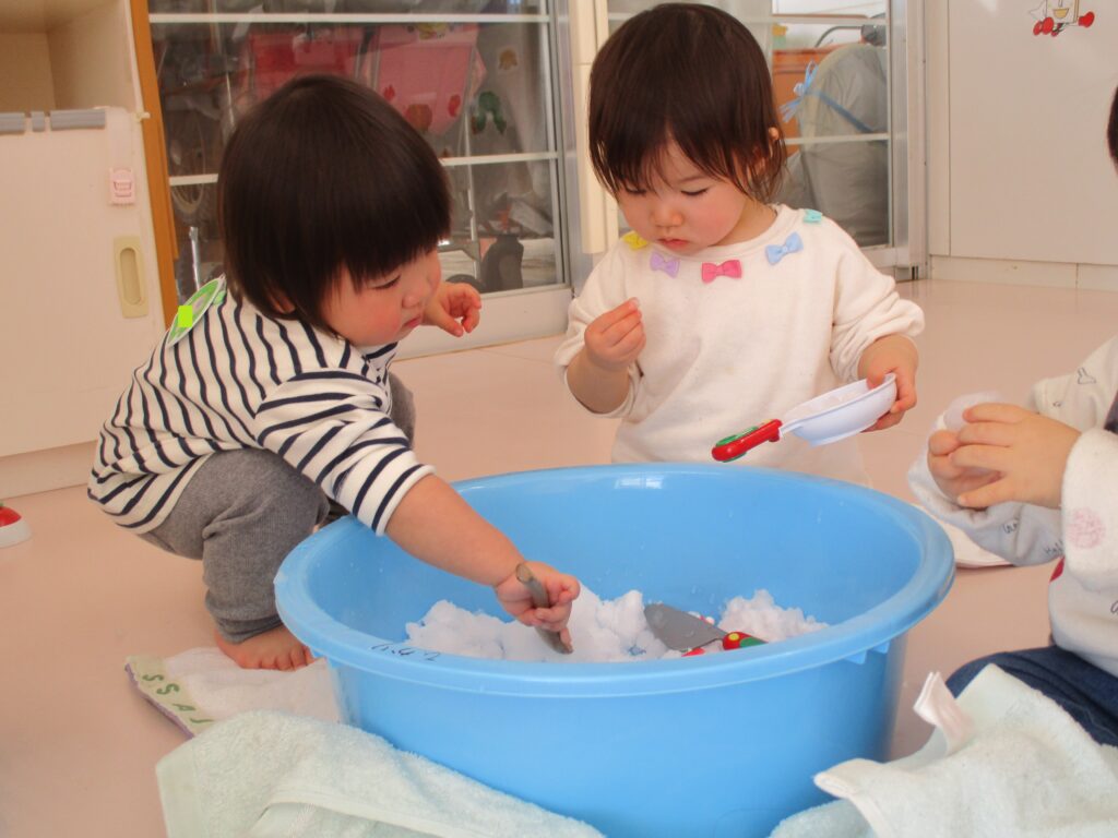 今年はあまり雪が降りませんでしたが、雪が積もった日は室内外で雪遊びを楽しんだ子ども達です⛄。触ると解ける不思議さや冷たい感触、靴で踏んだ際の音など雪ならではの感覚を味わうことができました。