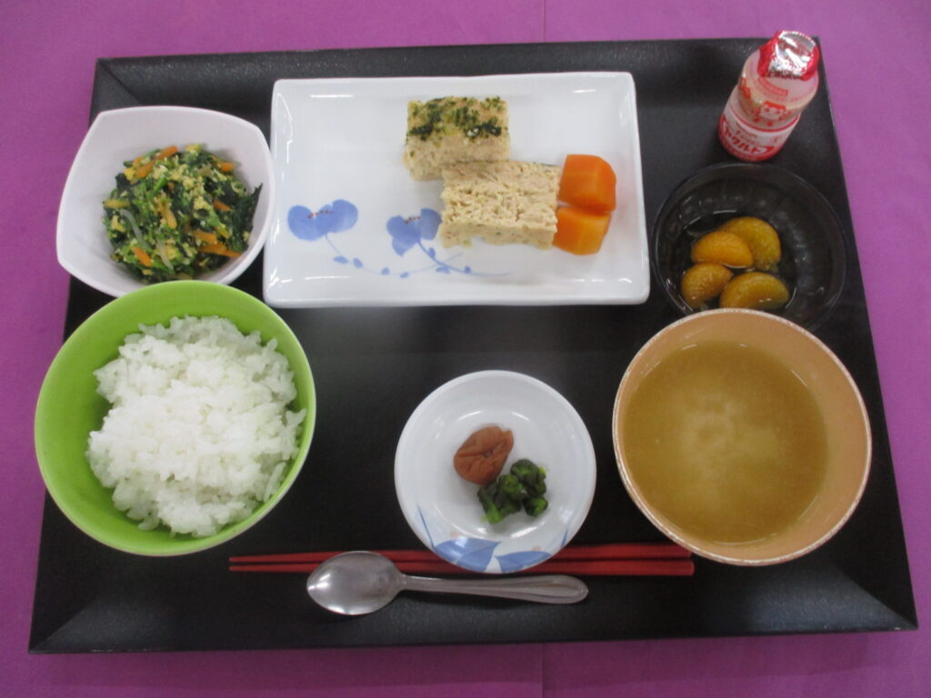 松風焼き ほうれん草と炒り卵」の和え物 ご飯 味噌汁 漬物 果物🍍🍍🍍