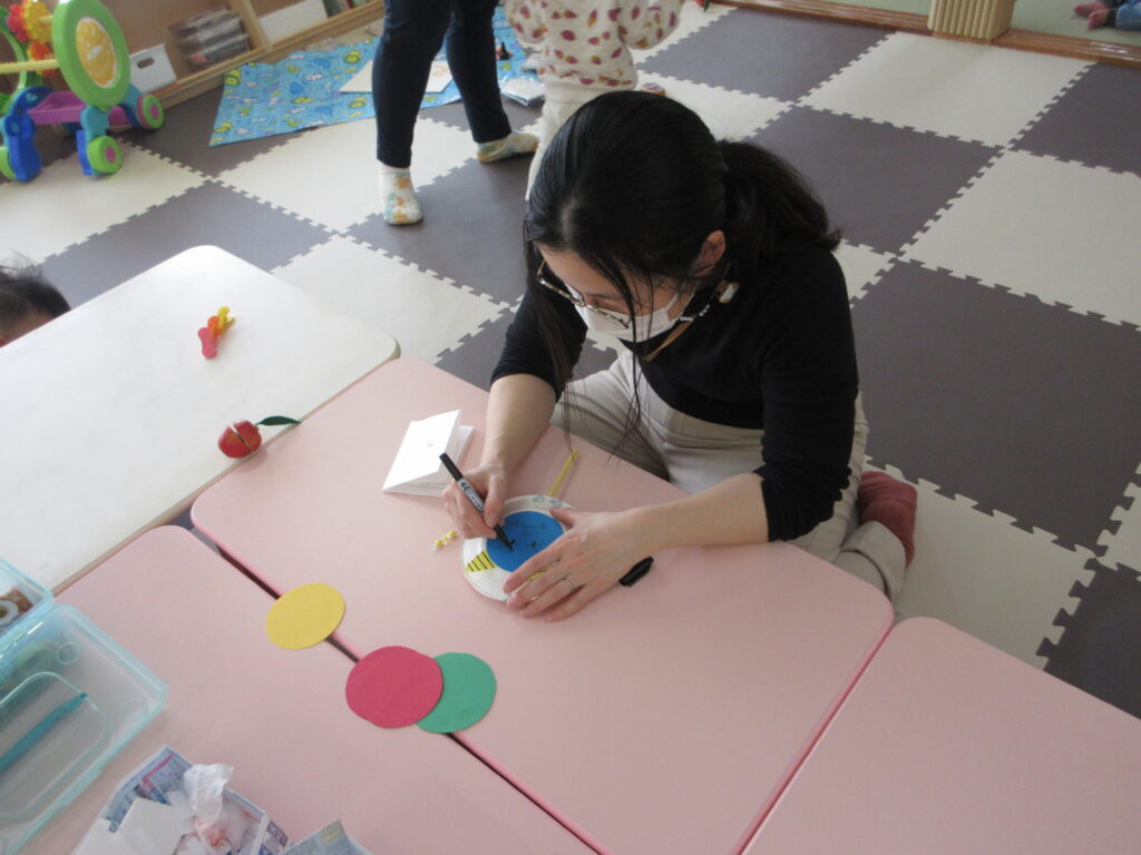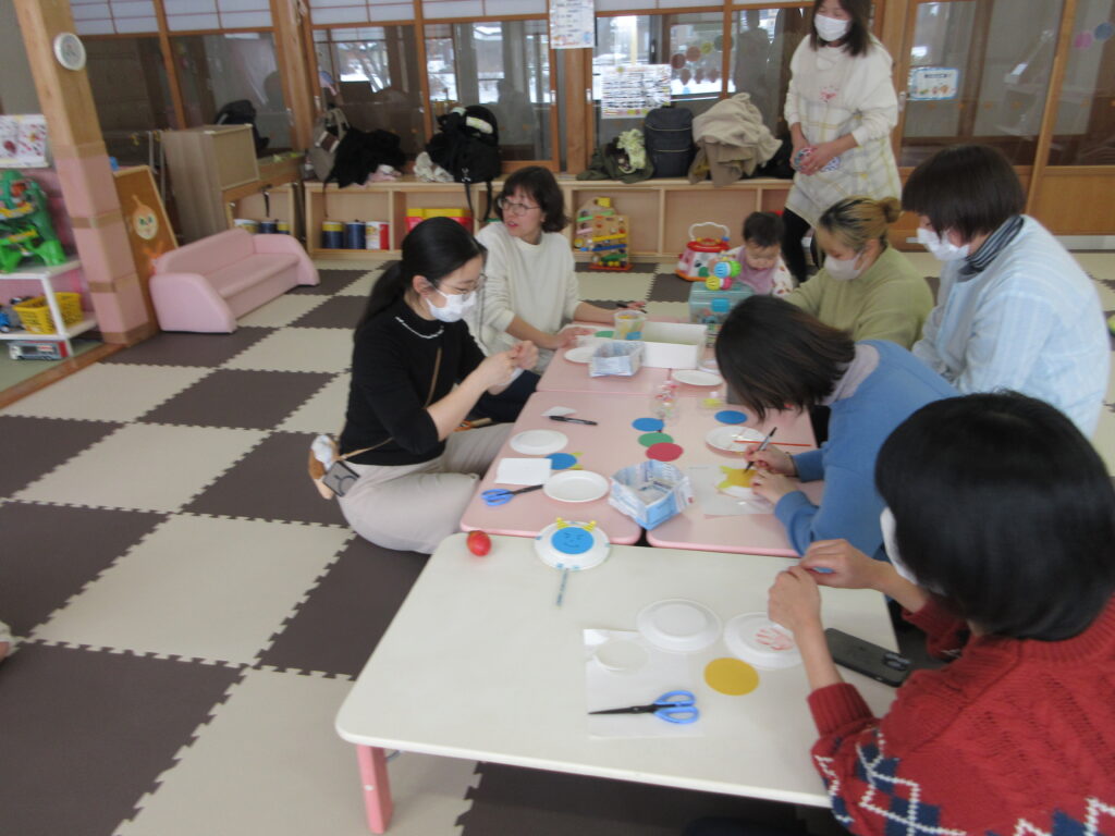 保育園の豆まき会に参加した後は、支援センターのお部屋に戻り、でんでん太鼓の制作をしました。