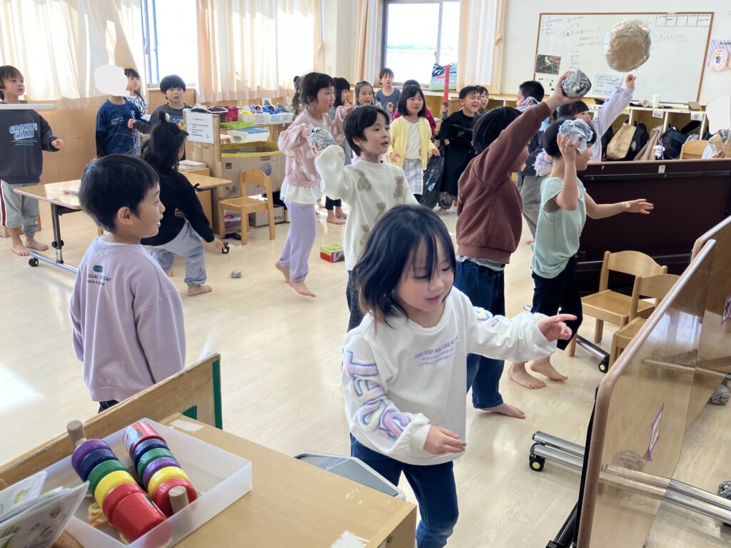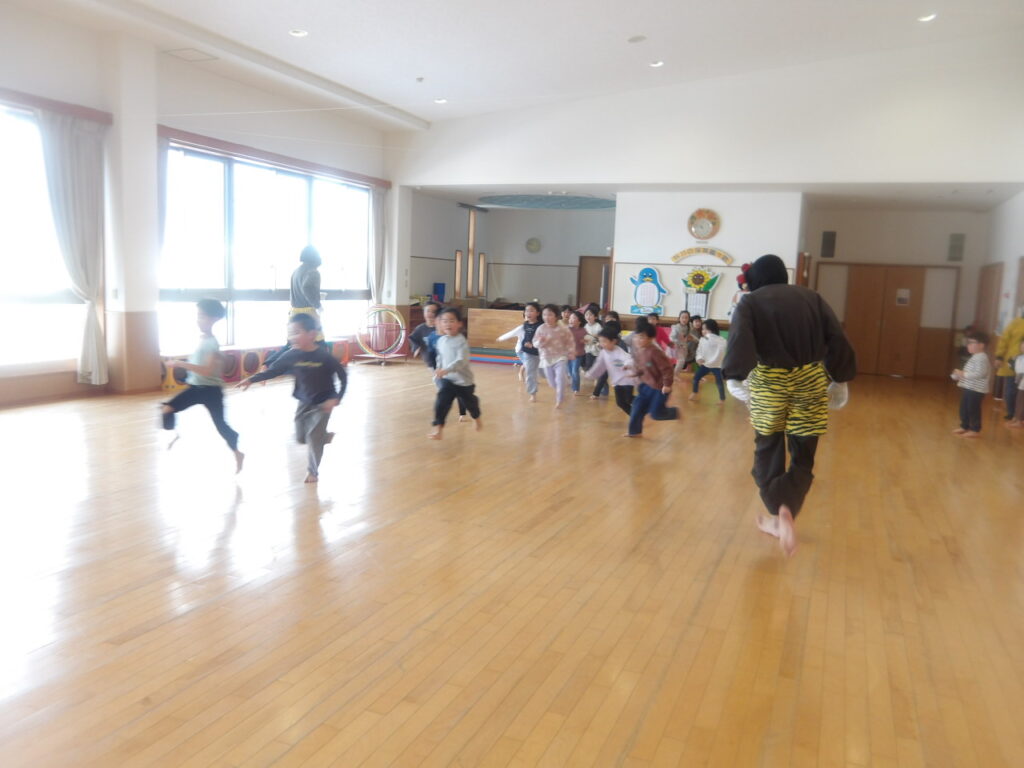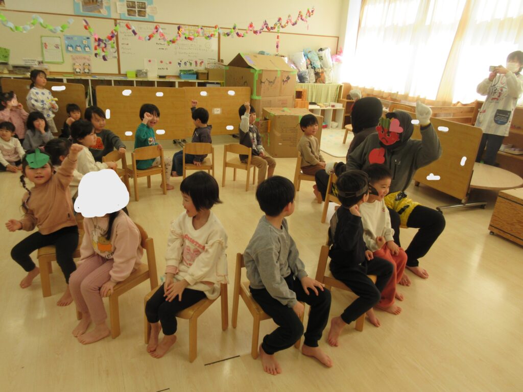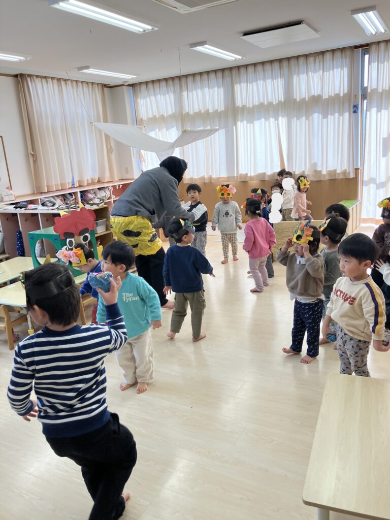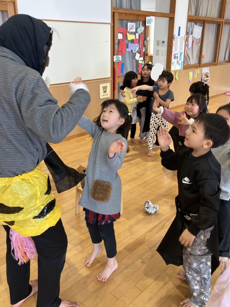 心の中の鬼をやっつけた後は、鬼と一緒にダンスや椅子取りゲーム、鬼ごっこなどを楽しみました。「一緒にあ~そ~ぼ!」と鬼と遊べる事を喜んでいる様子でした。