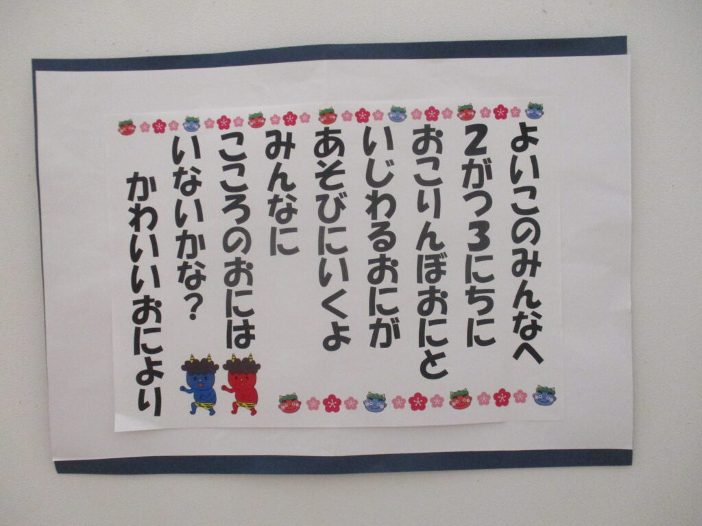 1月22日に豆まき会の事前会を行い、鬼からの手紙を紹介したり、節分についてのクイズをした後、子ども達の中にいるどんな心の鬼を倒したいのか、作戦会議をしました。その中で一緒にかわいい鬼と何をしたいかなどをクラスごとで話し合って決めました。