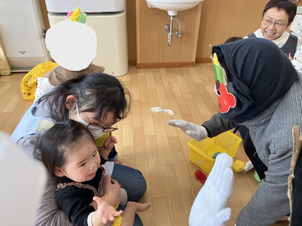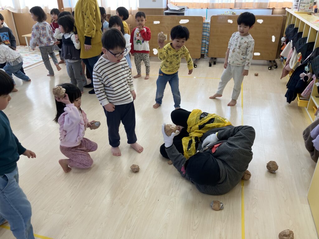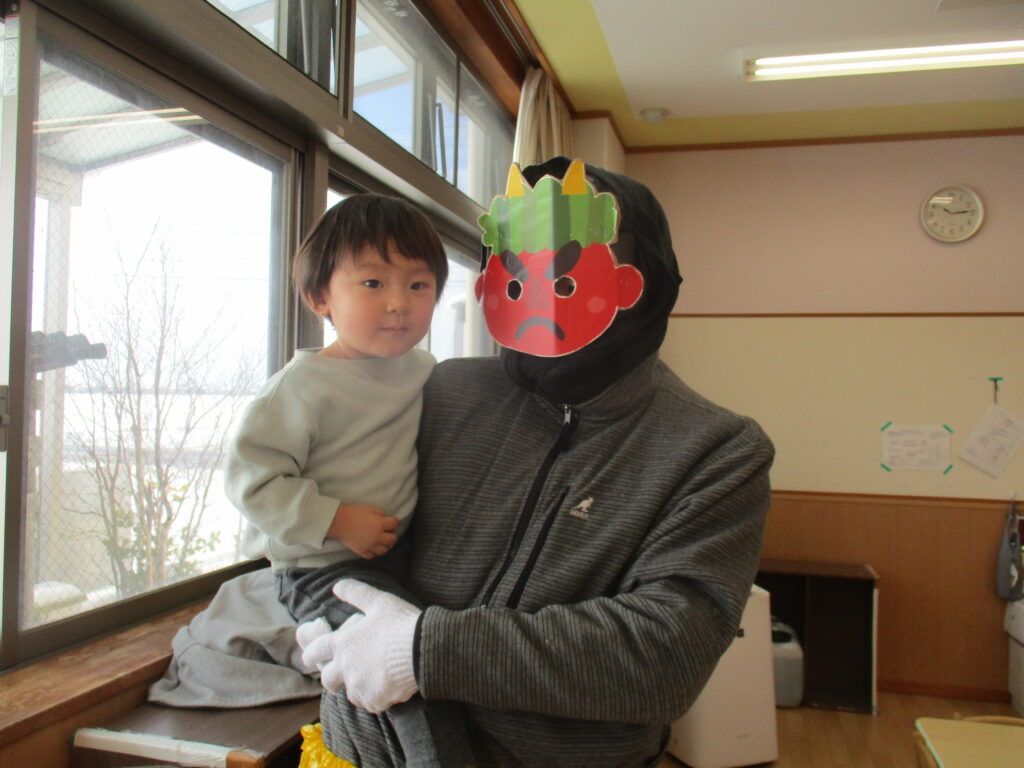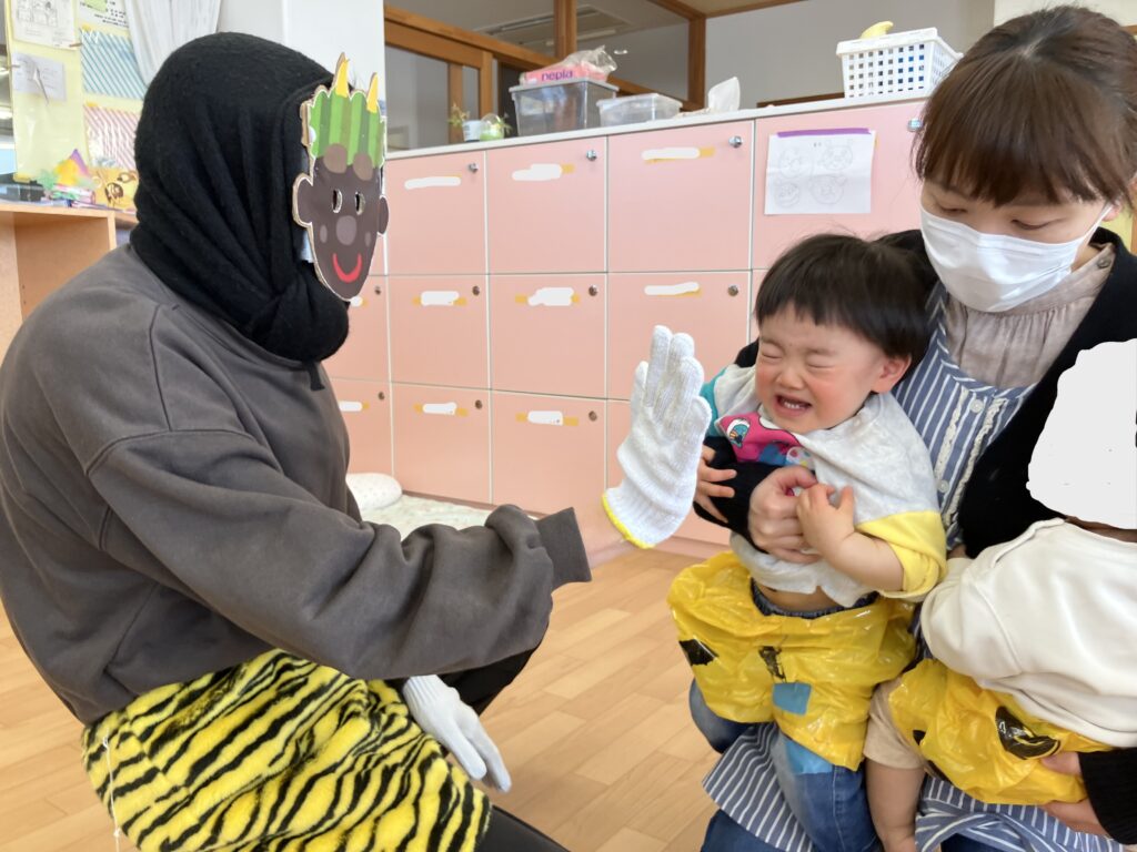 たまご・ひよこ・りす組さんは、やってきた鬼にびっくりしつつも勇気を出して豆を投げたり、慣れてきたら鬼とタッチや、抱っこをしてもらいました。