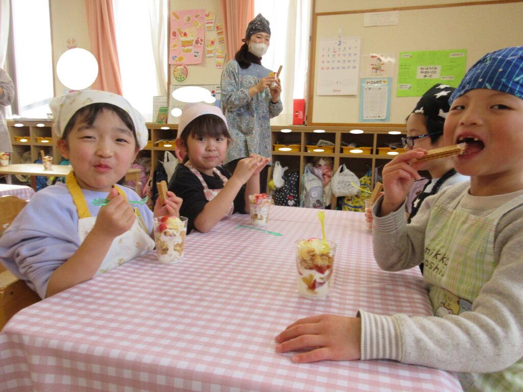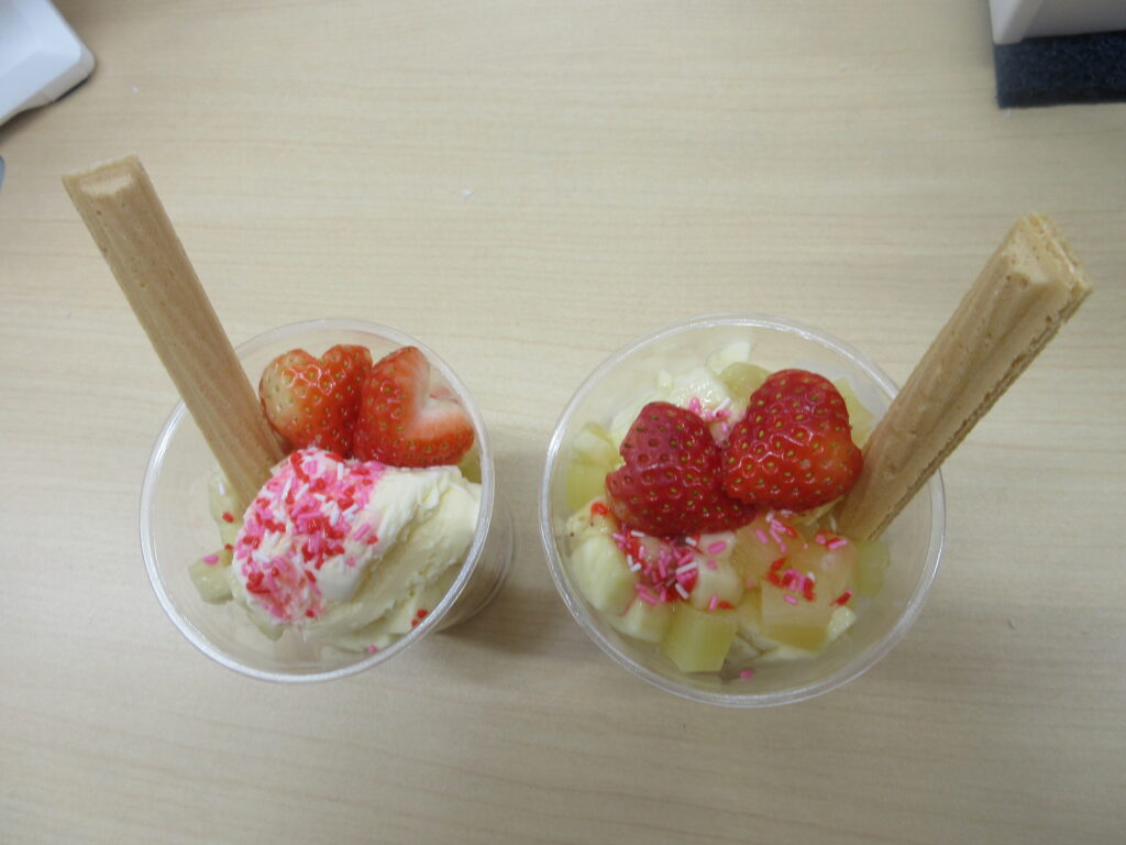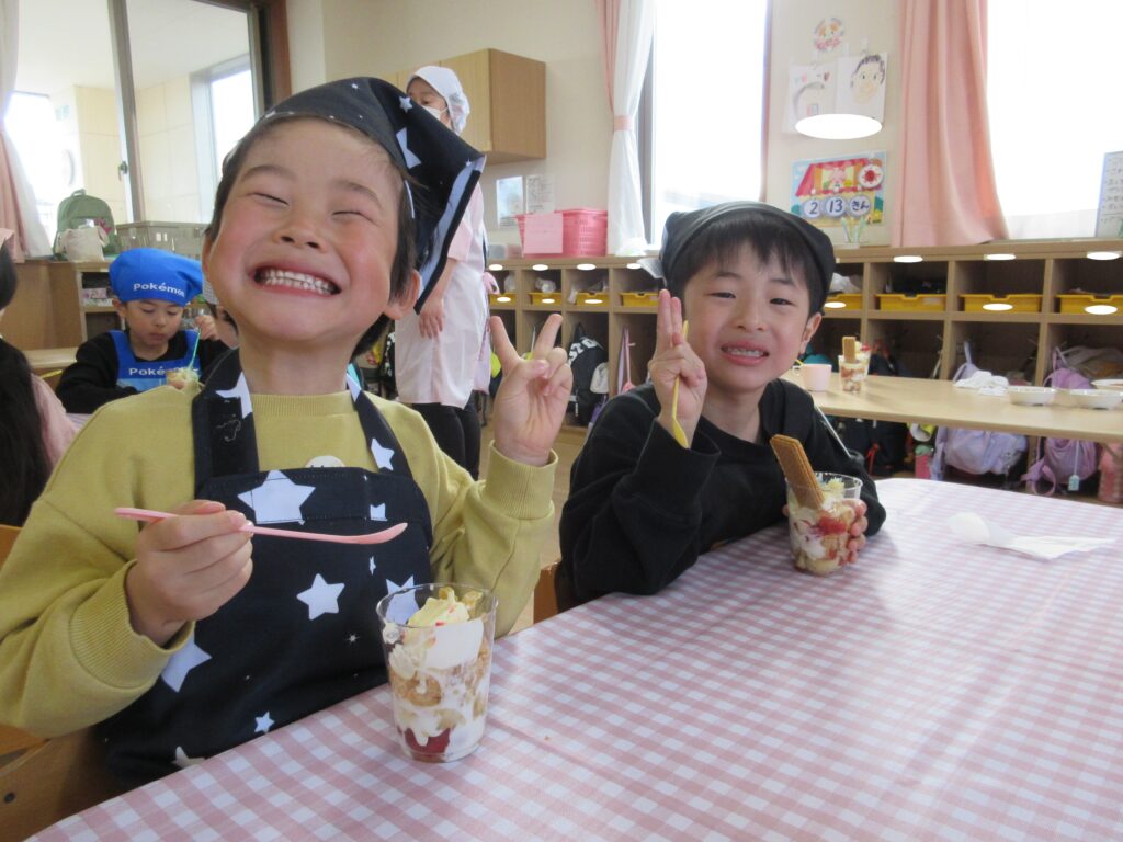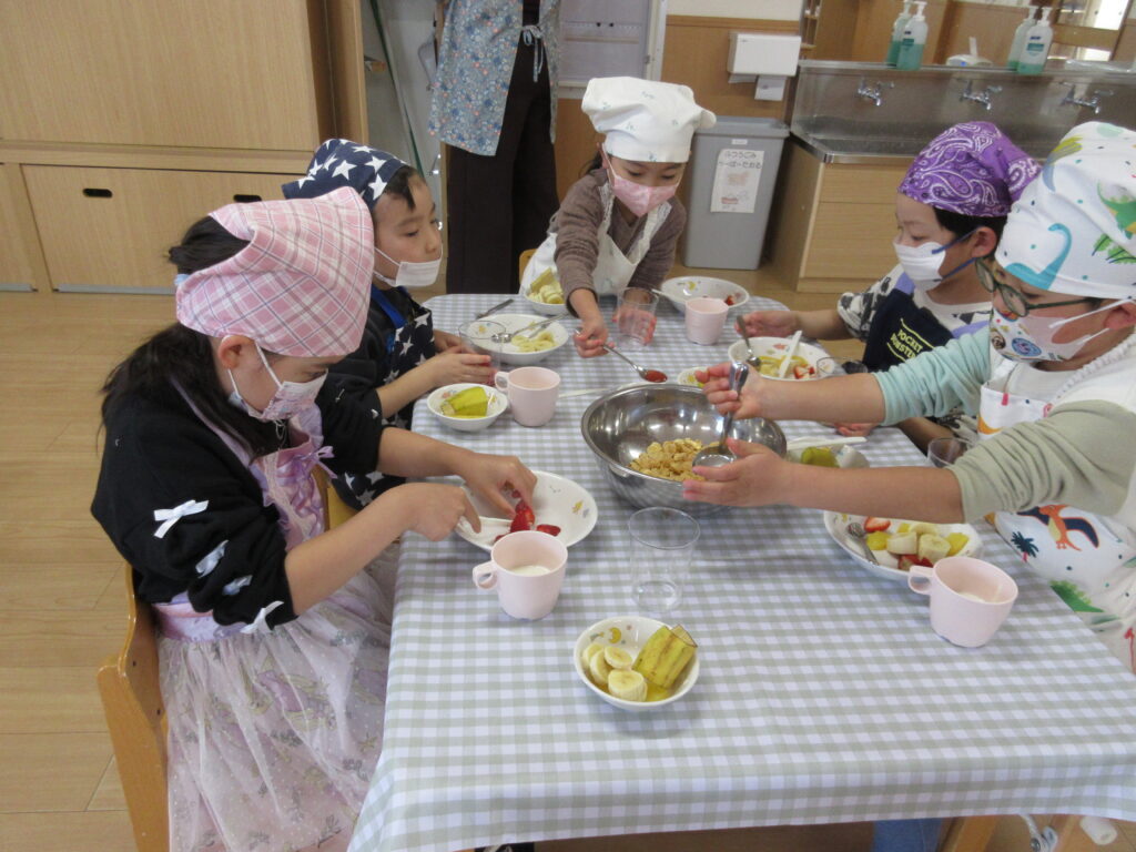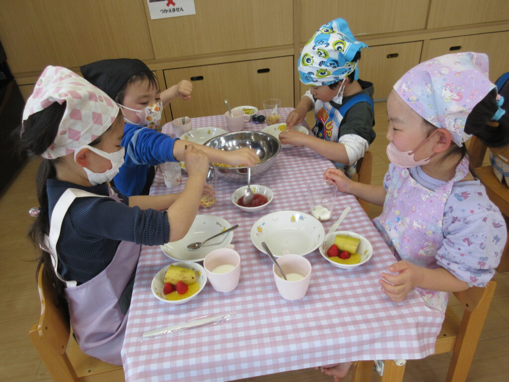 おやつに『オリジナルパフェ🍨』を作りました!果物やトッピングなどを選んで、楽しみながらクッキング♬素敵なパフェになりましたよ♡