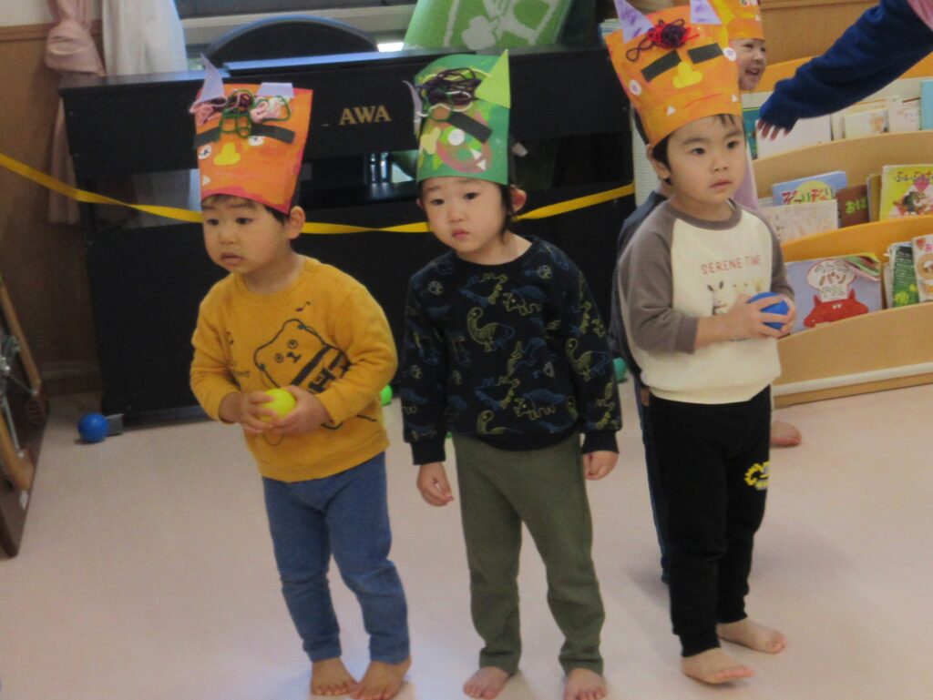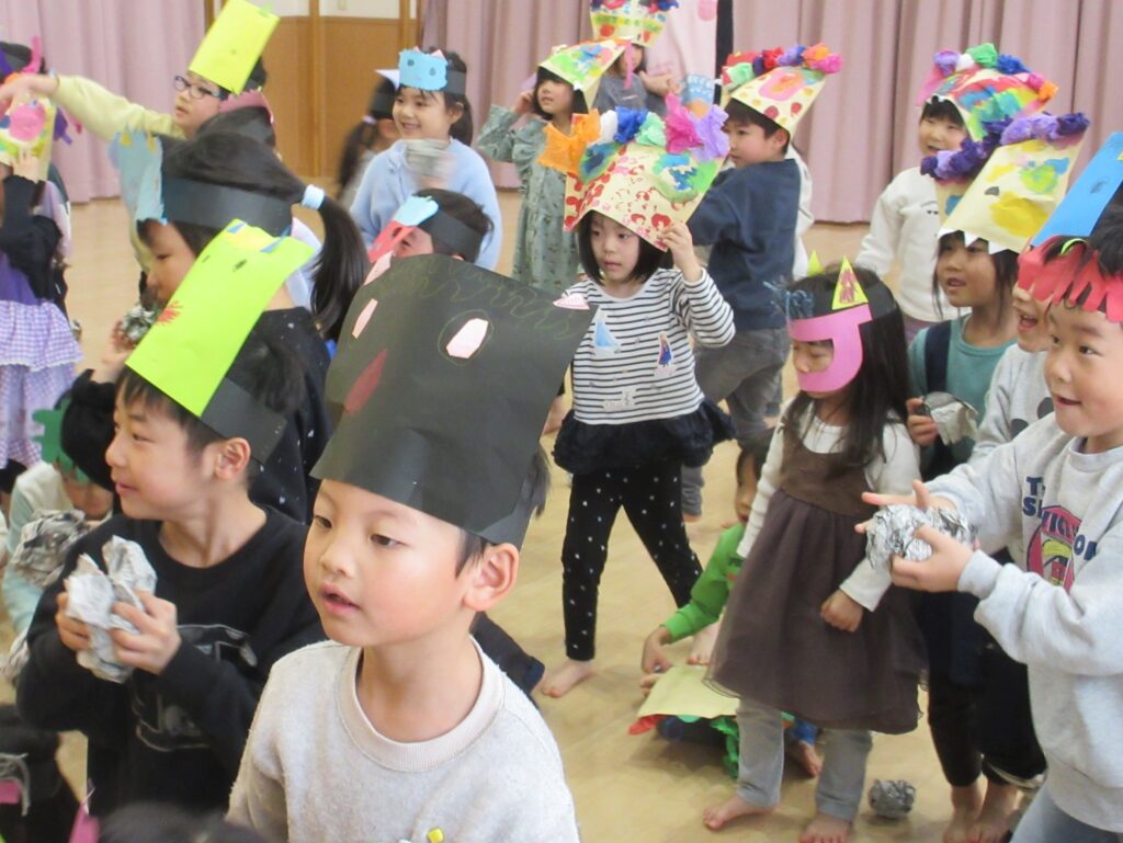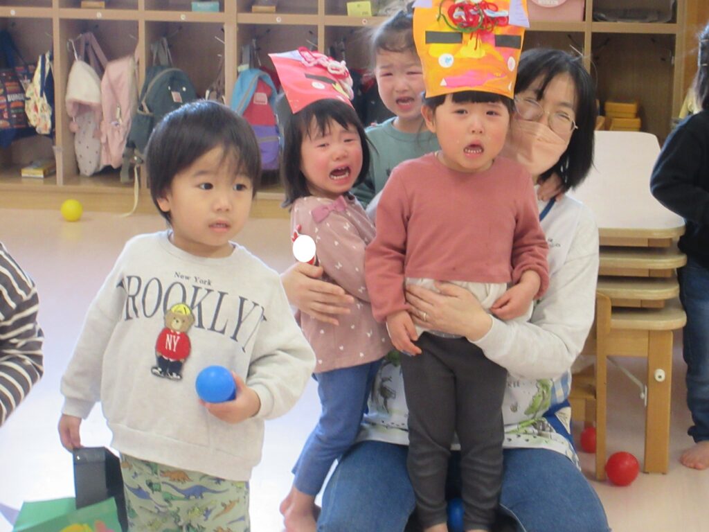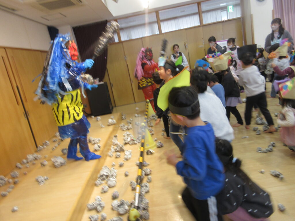 2月3日の節分は誕生会も兼ねて、楽しみました。各クラスで作った鬼のお面を身に付けホールに集まりましたよ♬クイズで節分の由来に触れたあとは、赤鬼と青鬼が登場★一生懸命に新聞紙で作った豆を投げて退治しました😊