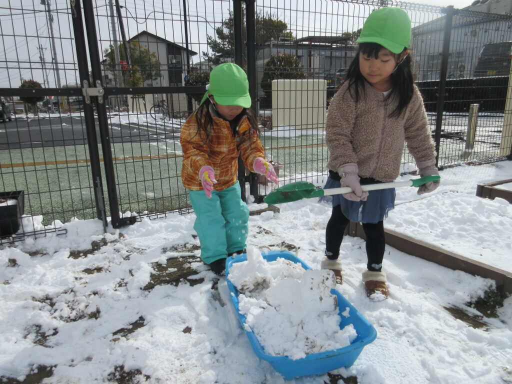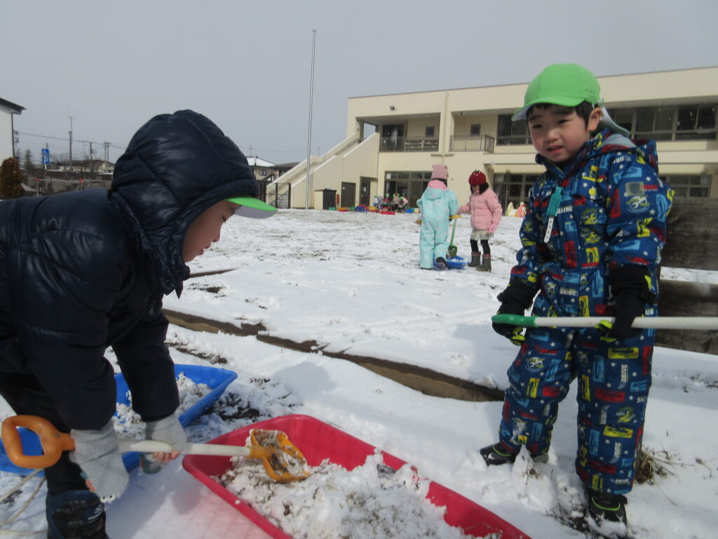 今年はなかなか雪遊びが出来ず、残念な子どもたち…園庭が真っ白になった日、大はしゃぎで外に出ていきましたよ☆