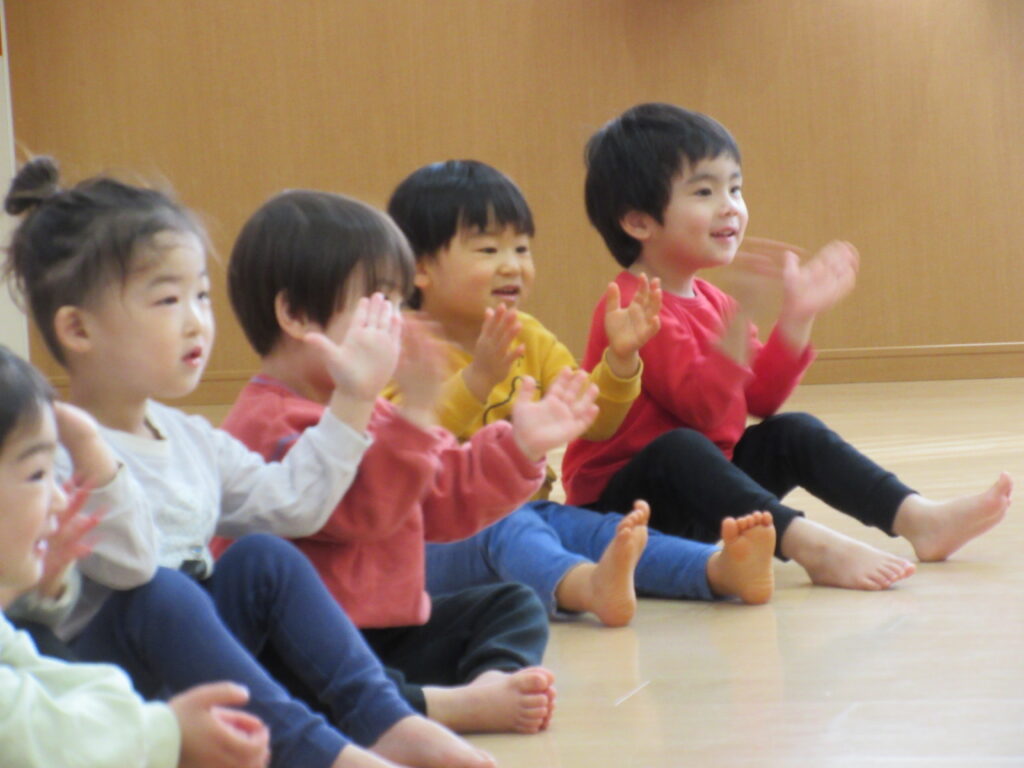 3歳児:始めから私の言葉やピアノの音に集中していてとても嬉しかったです。活動中にさり気なくアイコンタクトをしてくれたり、笑顔いっぱいだったりと思い思いに楽しんで身体を動かす姿がとても印象的でした!最後には、自然と「もっとやりたい」という言葉が出てきて楽しんでもらえたのだなと感じました。