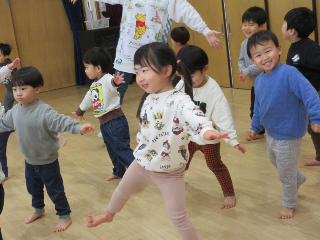 2歳児:「はじめまして」の挨拶から目がキラキラと輝いていました★声やピアノの音をよく聴いて、次はどんな動きかイメージして体を動かす子どもたちが素晴らしかったです!運動能力も高く、身体の使い方もとっても上手でした!普段から、様々な表現や運動遊びを取り入れているからこその姿だと思います。