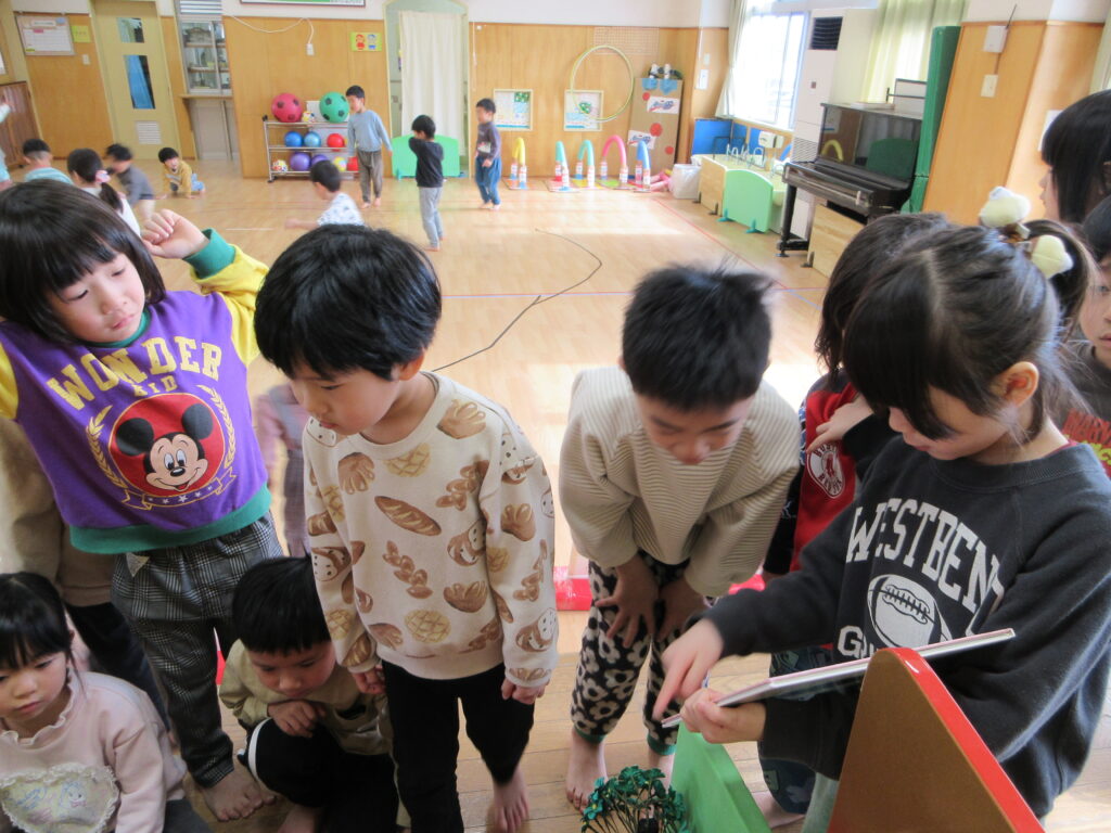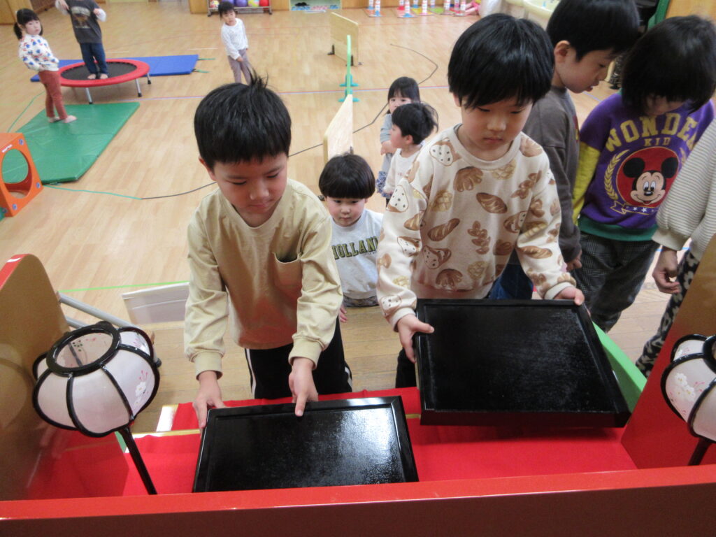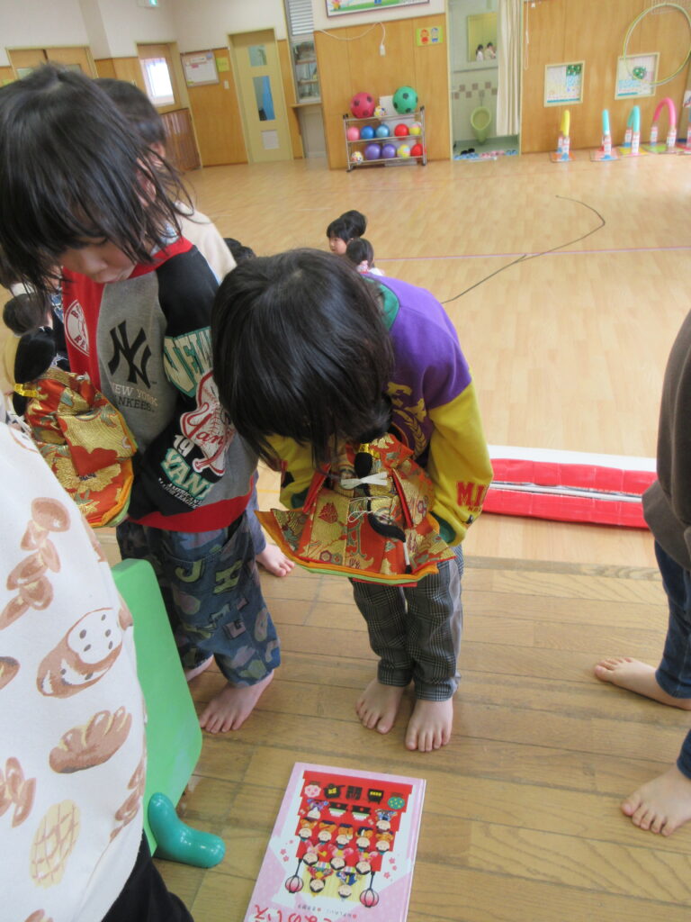 ひな祭りの絵本を見て、同じ並べ方になるように話し合いながら行いました。今回はお雛様を出している様子をお伝えします。