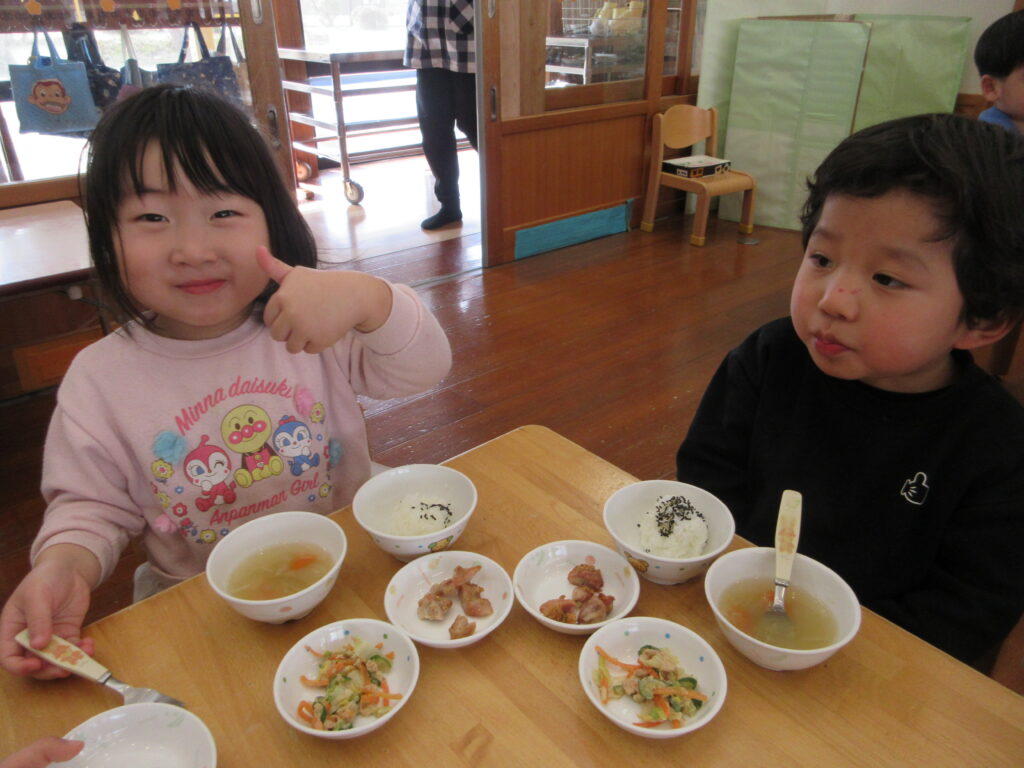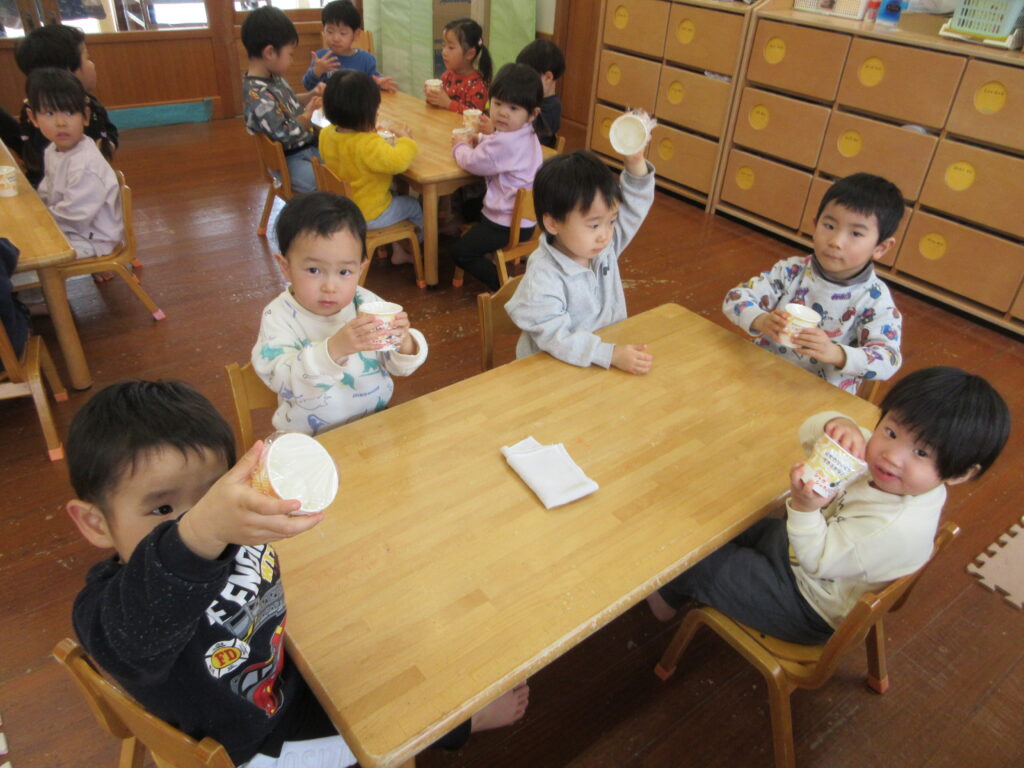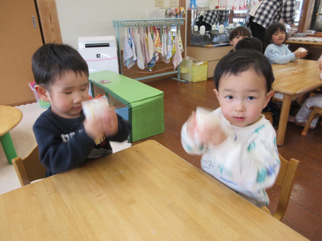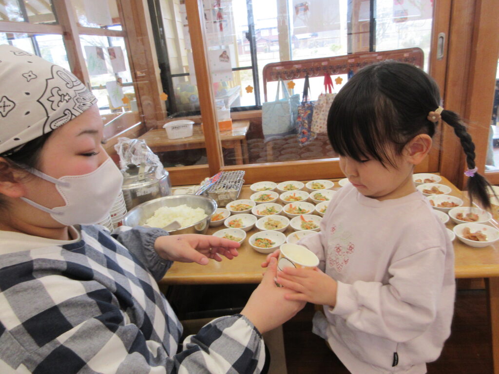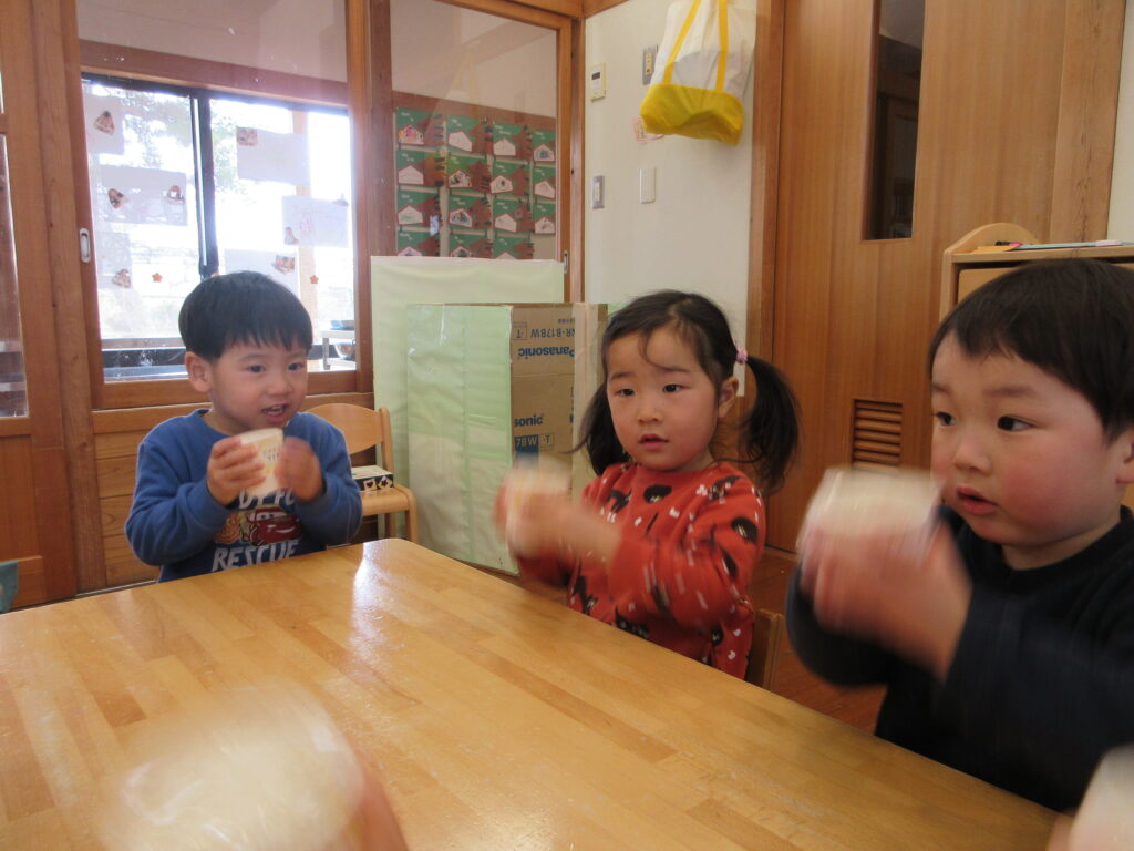 給食の時間にシャカシャカおにぎり作りをしました。カップにおにぎりを入れてラップで蓋をすると勢いよく上下に振って形作り。少しずつ形ができると「丸くなってきた。」「かわいい」とお友だちと見せ合っていました。