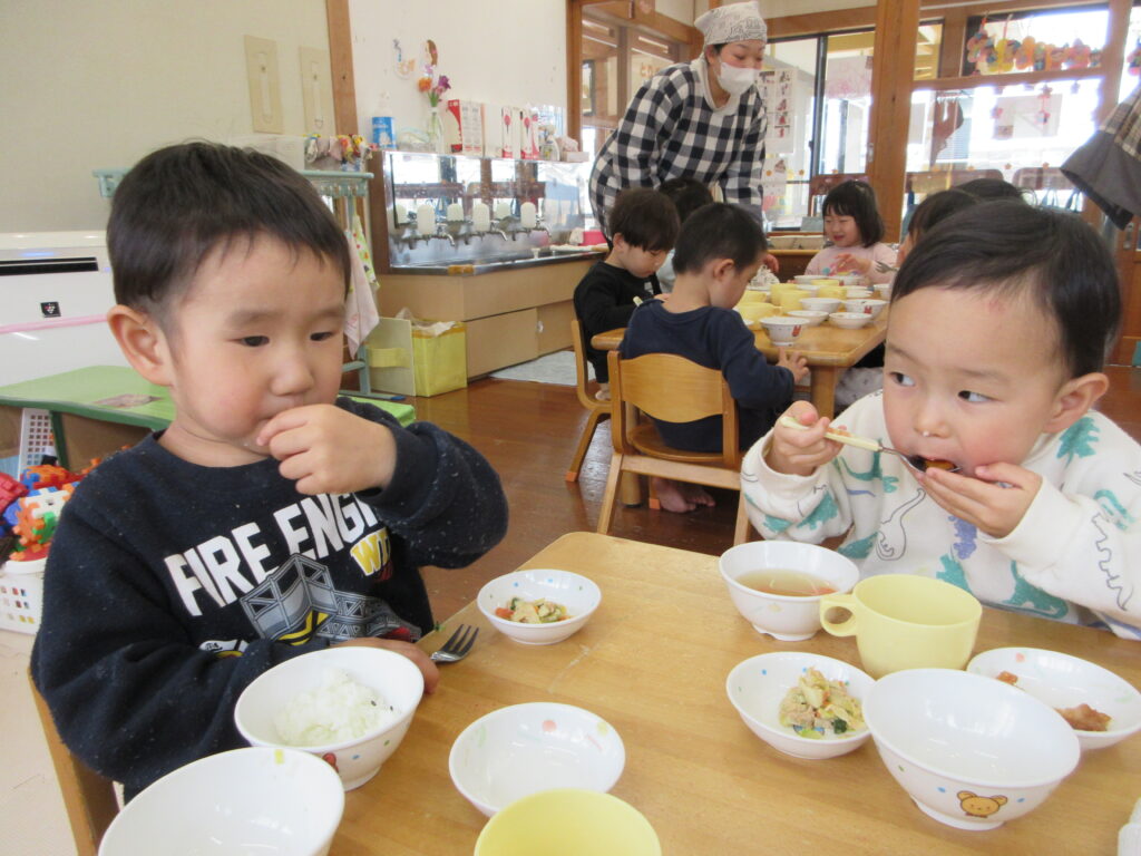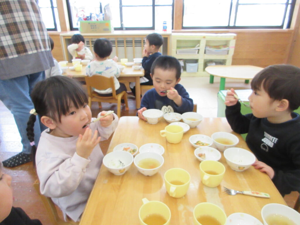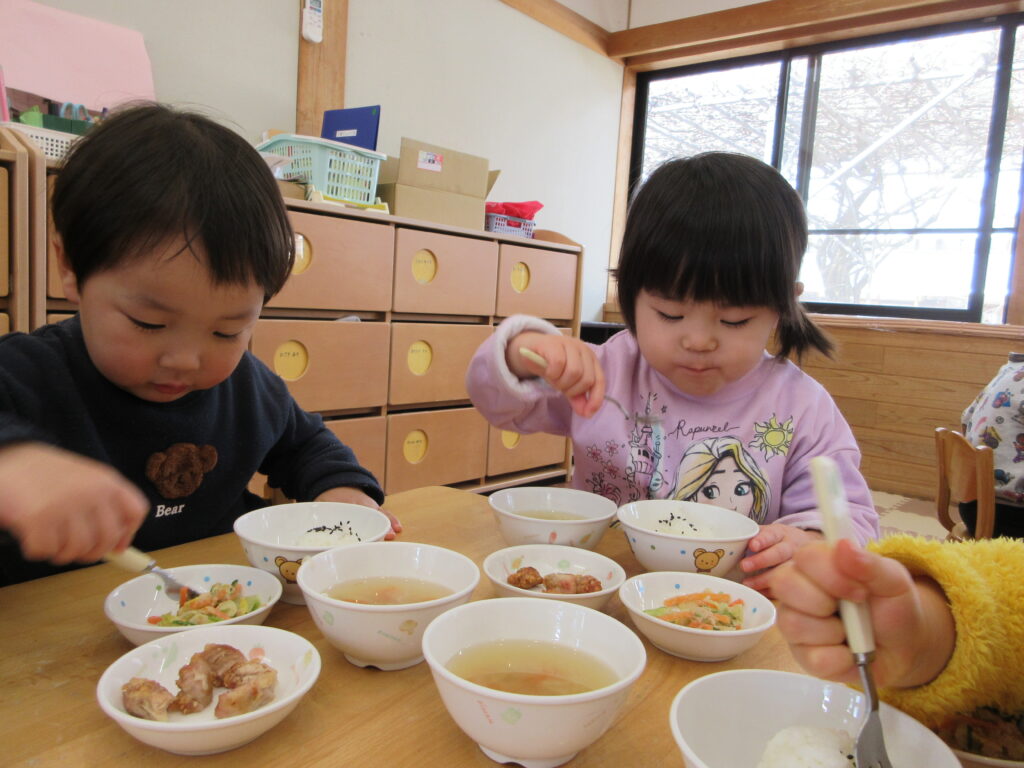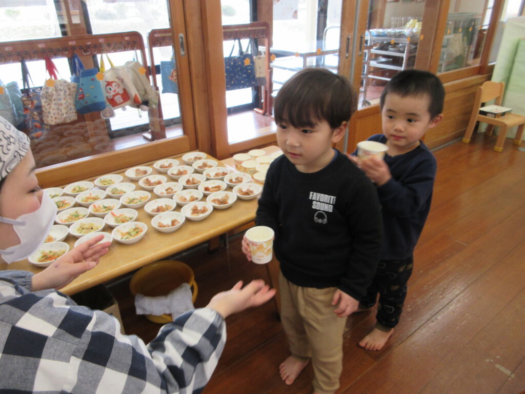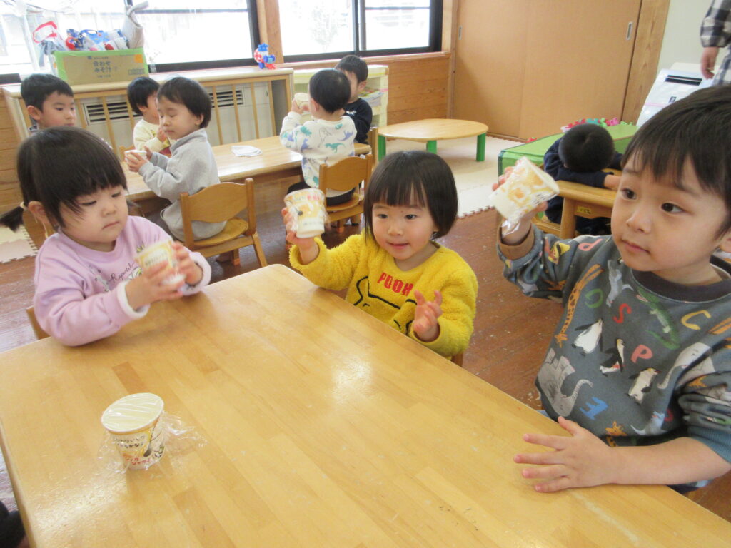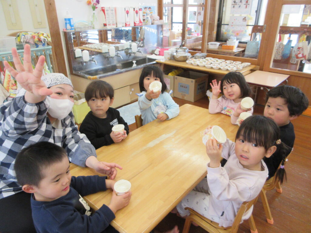 給食の時間にシャカシャカおにぎり作りをしました。カップにおにぎりを入れてラップで蓋をすると勢いよく上下に振って形作り。少しずつ形ができると「丸くなってきた。」「かわいい」とお友だちと見せ合っていました。