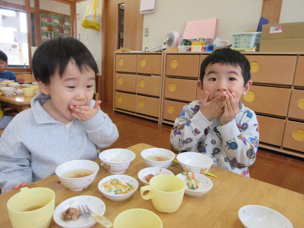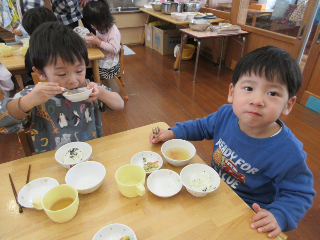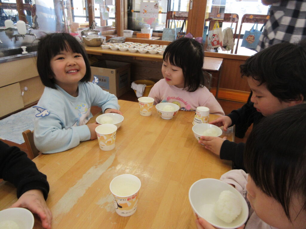 最後にゴマ塩もかけてもらい、自分たちで作ったおにぎりは格別。「おいしいね。」と嬉しそうにあっという間に食べ終えていました。