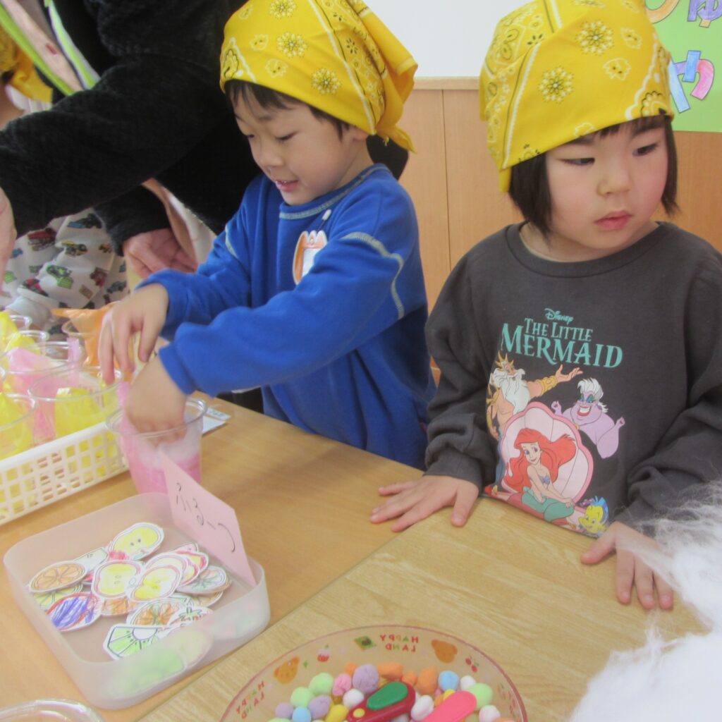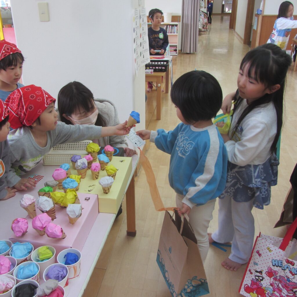 たまごっち屋さん、たこ焼き屋さん、ジュース屋さん、お寿司屋さん、アイス屋さんをばら組、ゆり組、ひまわり組3クラスでペアになりお店屋さんになったりお客さんになったりとても楽しんでいましたよ!