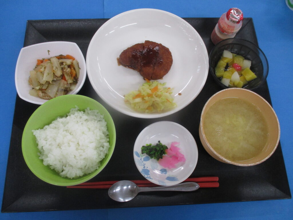 チキンカツのソースがらめ ならえ ご飯 味噌汁 漬物 果物🍓🍓🍓