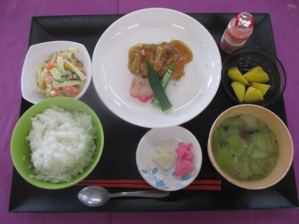 鶏肉のはちみつ煮 マカロニサラダ ご飯 味噌汁 漬物 果物🍇🍇🍇