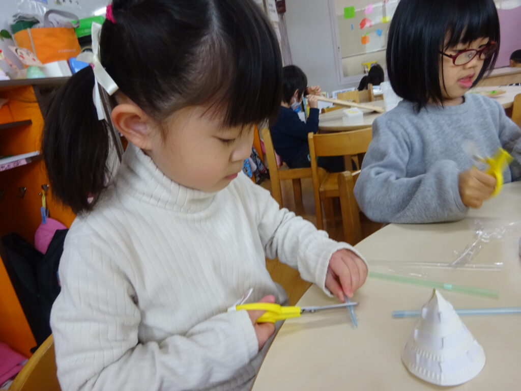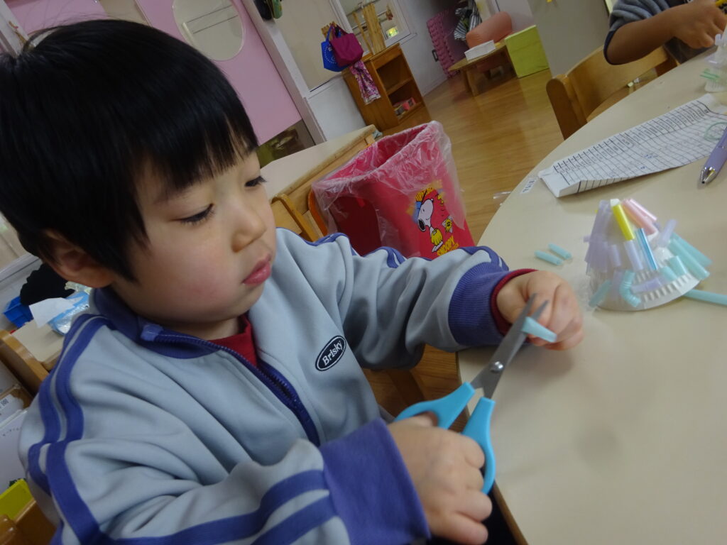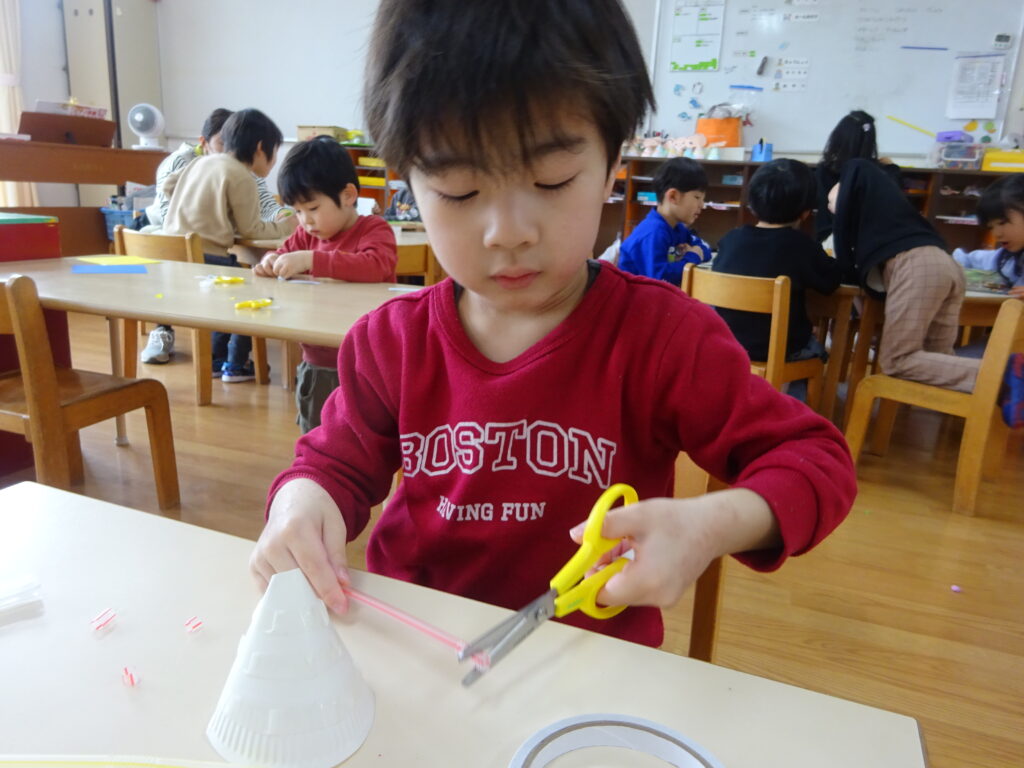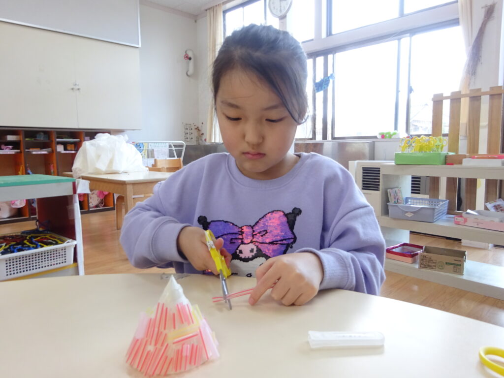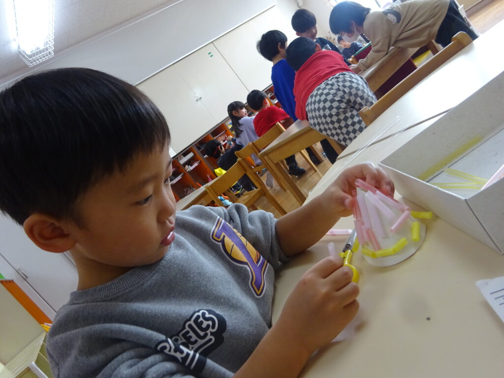 今までの制作では紙や牛乳パックなど切りやすい物をはさみで切ることが多かったですが、今回はストロー切りに挑戦!切る為に力が必要なことやストローが飛ばないように切り方を工夫しなくてはいけないことに気付くと、ストローを下に向けて切ったり優しく力を入れながら切ったりと子どもたちなりに工夫しながら取り組む姿が見られました。