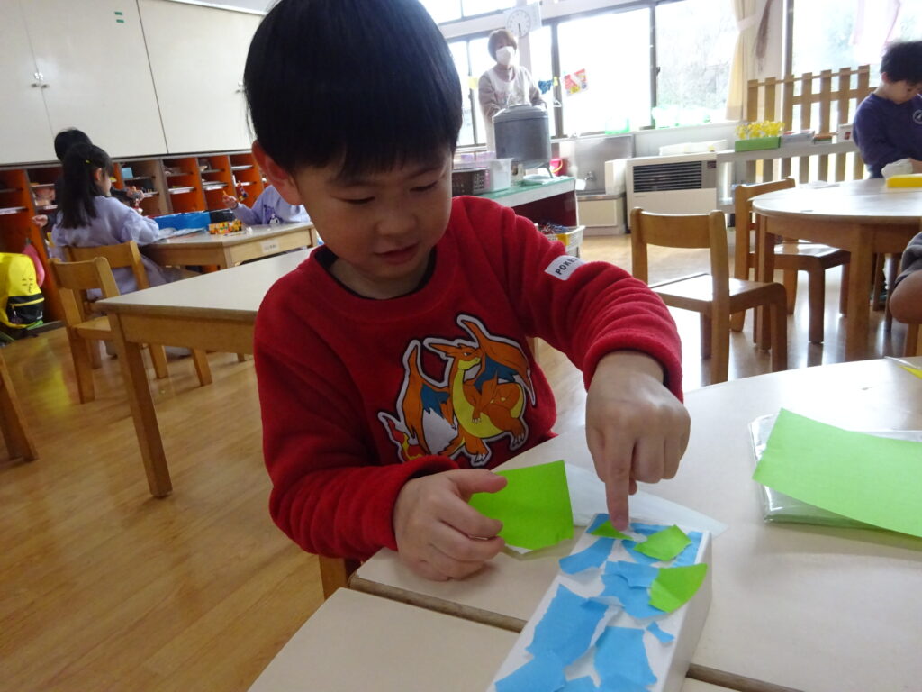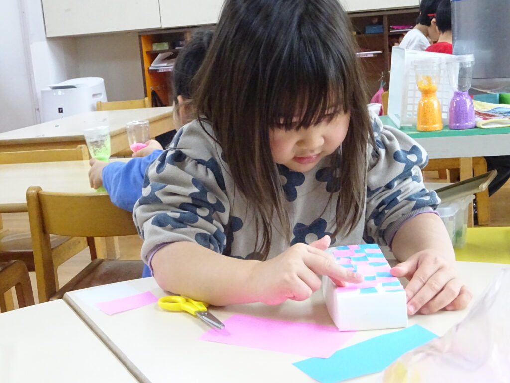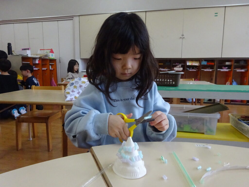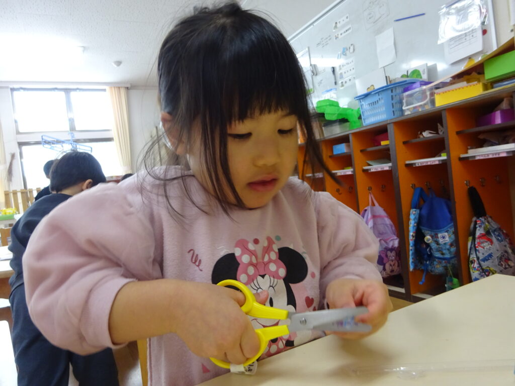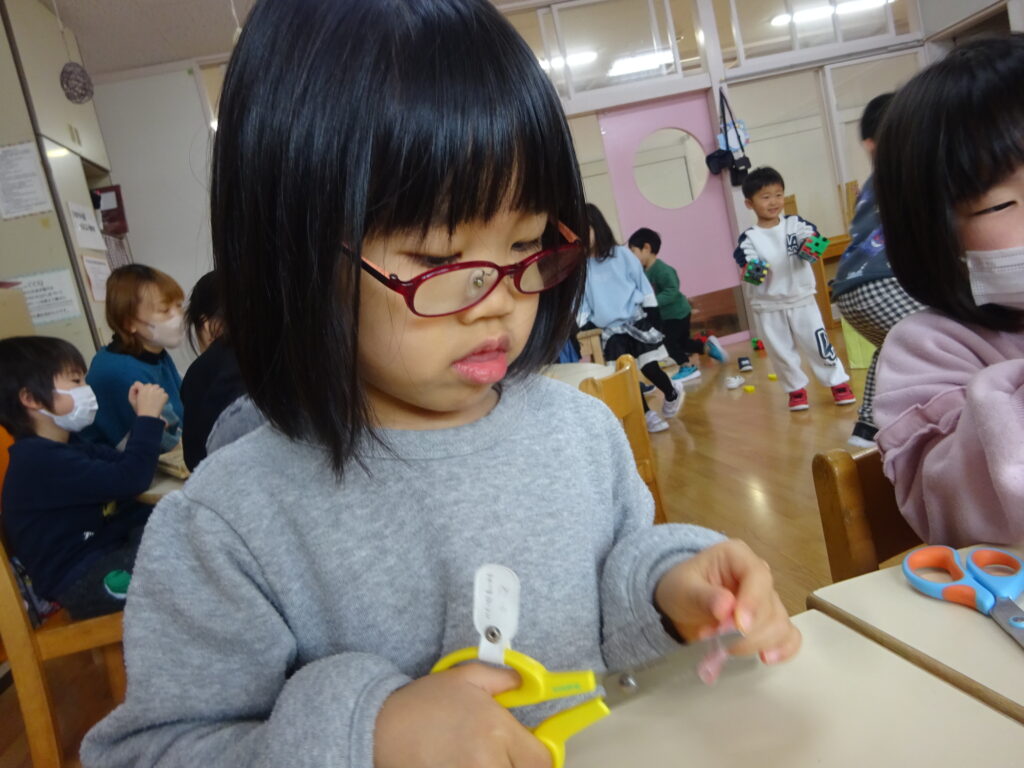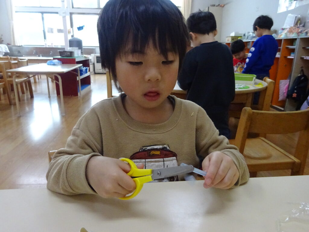 今までの制作では紙や牛乳パックなど切りやすい物をはさみで切ることが多かったですが、今回はストロー切りに挑戦!切る為に力が必要なことやストローが飛ばないように切り方を工夫しなくてはいけないことに気付くと、ストローを下に向けて切ったり優しく力を入れながら切ったりと子どもたちなりに工夫しながら取り組む姿が見られました。