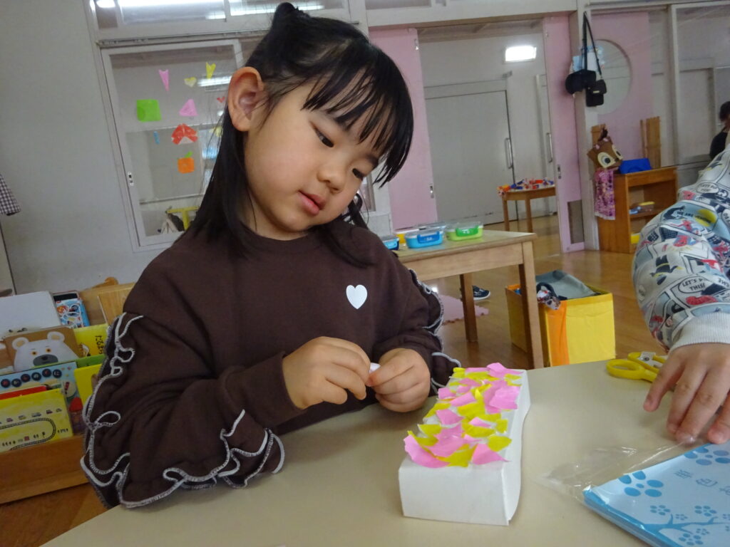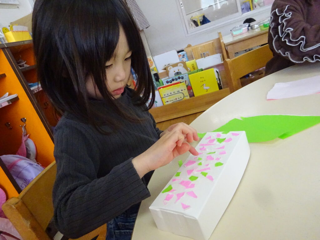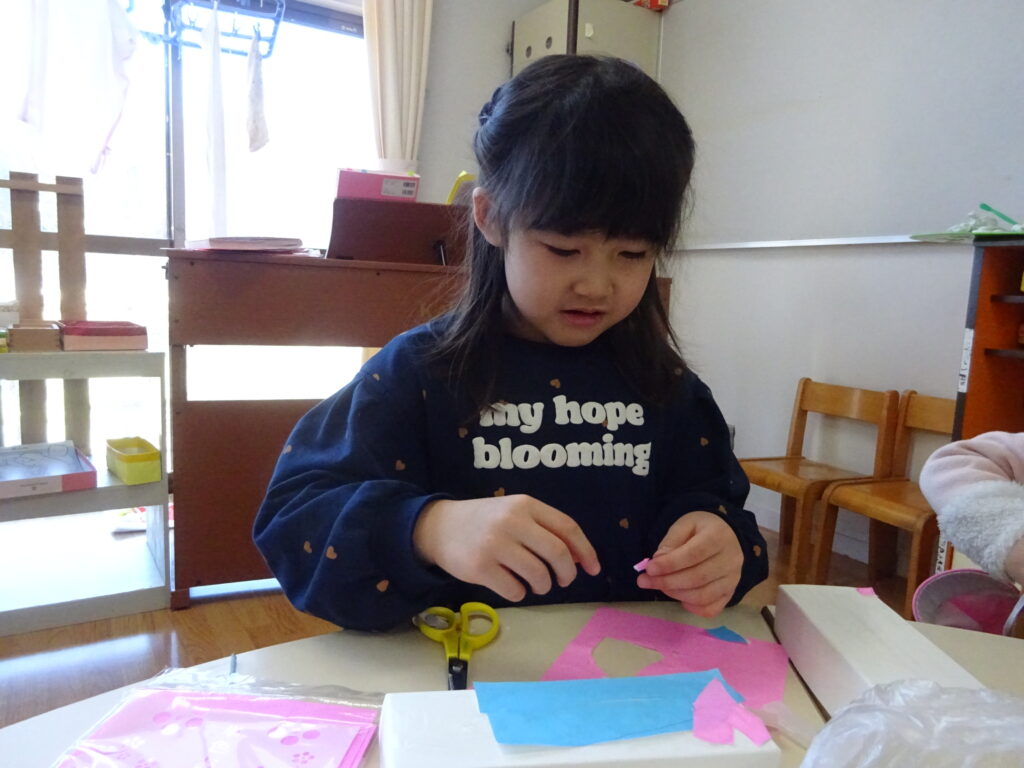 3月3日はひな祭り。先日お部屋でひな祭りに関する紙芝居を見て、「ひな祭りは女の子の成長と幸せを願う行事」ということを知った子どもたち。「みんなでお雛様作らない?」と保育者が聞くと「いいね!」という意見が多く、早速制作活動が始まりました😊