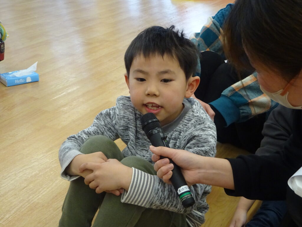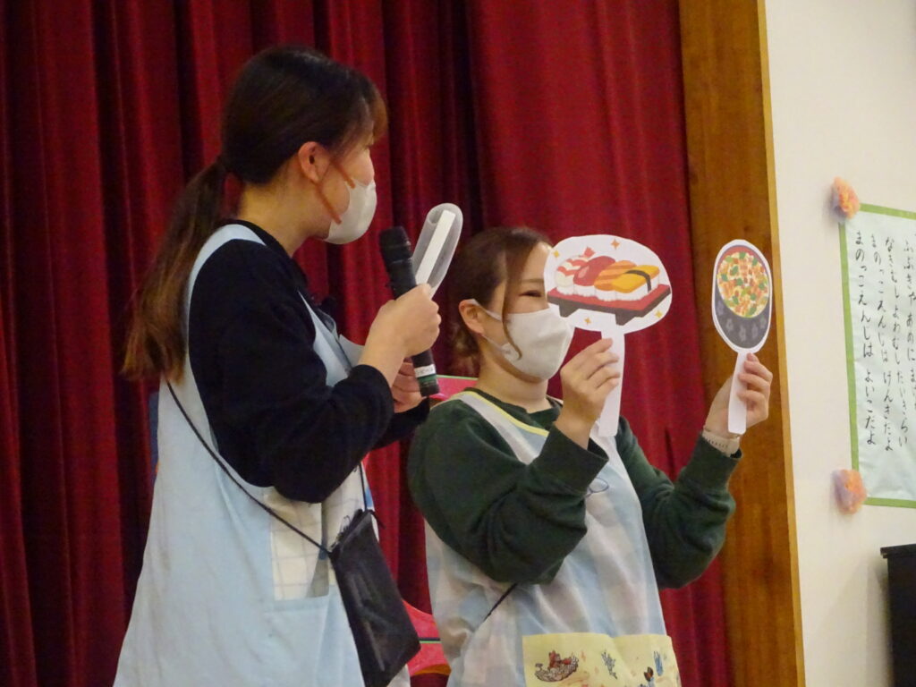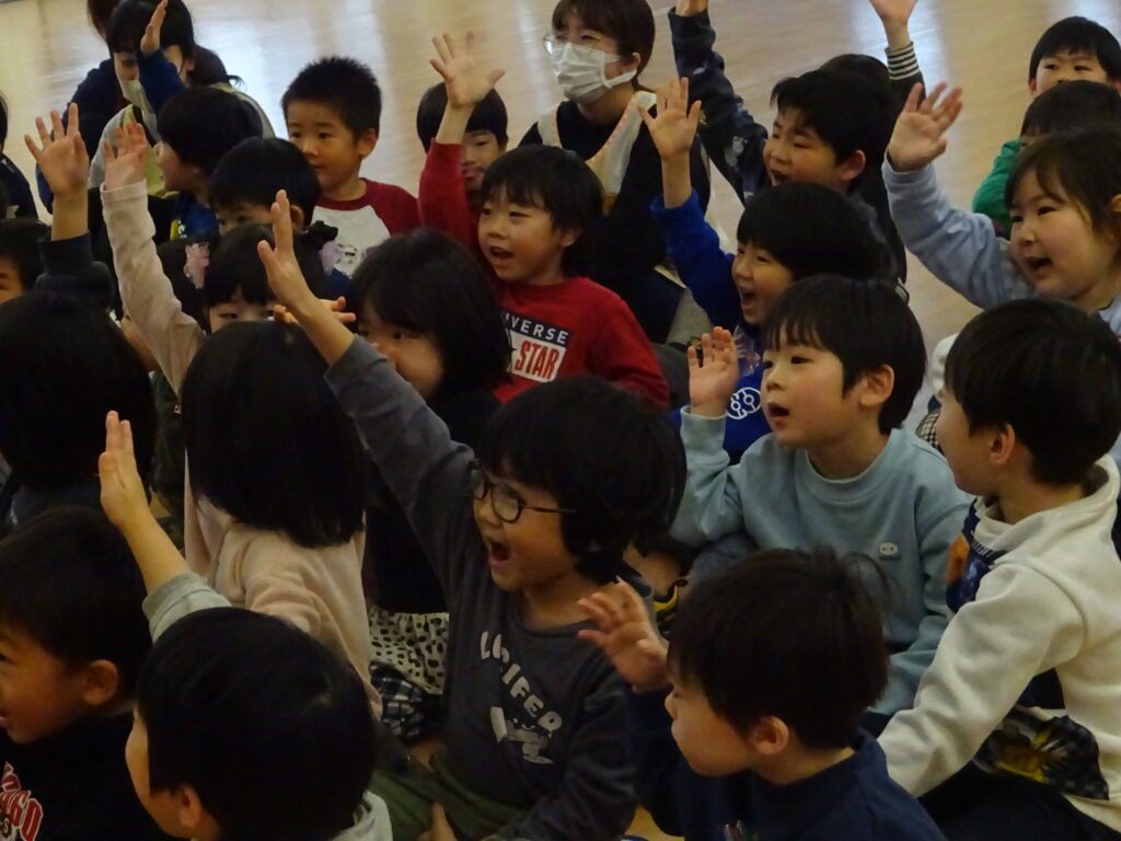 ひなまつりにちなんだ2択クイズも盛り上がりました。自分が正解だと思う方に元気よく手を挙げていて、どのクラスの子どもも楽しそうに参加していました!