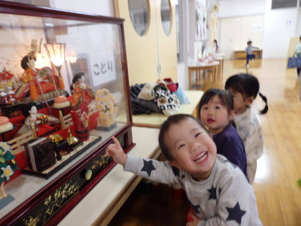 ひな飾りに込められている願いや行事の食べ物などの話を「へぇ~」「これ、知ってる!」と興味津々で聞いていた子どもたち。お内裏様とお雛様の本当の名前は男雛(おびな)と女雛(めびな)なんだよ、と保育者が話すと子どもたちは驚きの表情でした。