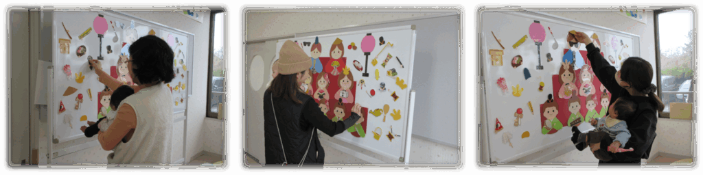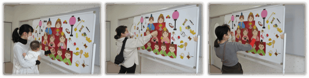 掲示してあるお雛様は色々なところが間違っているので、お母さんたちに直してもらいました!