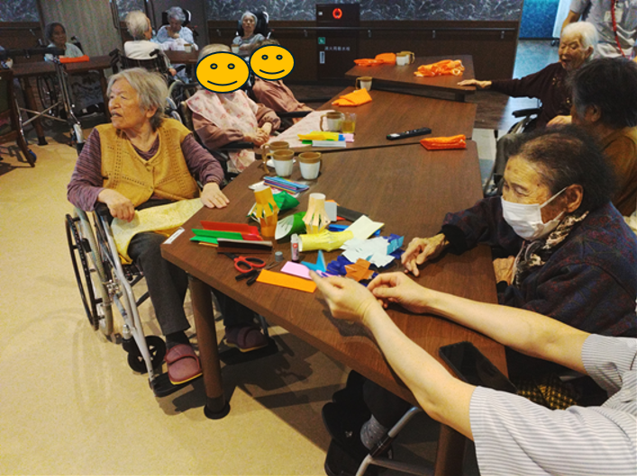 みんなで飾り作りにも挑戦し、色紙を折ったり、ちょっとした工夫を加