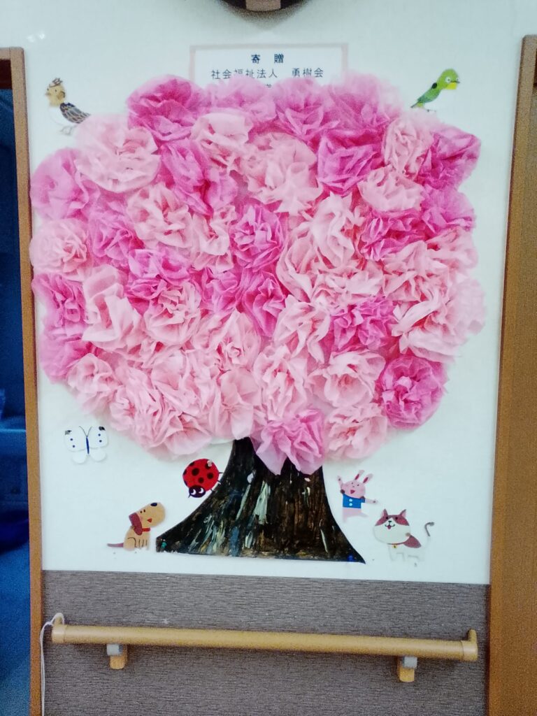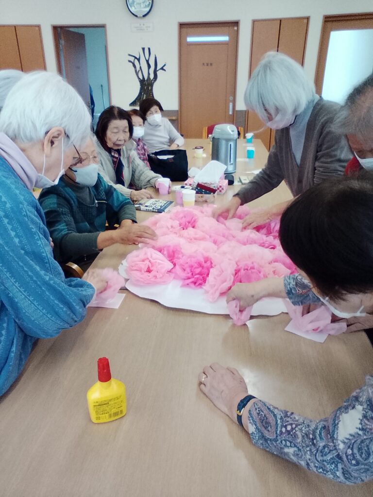 皆さんでたくさん作ったピンクのお花を大きな紙に張り付けて。。。