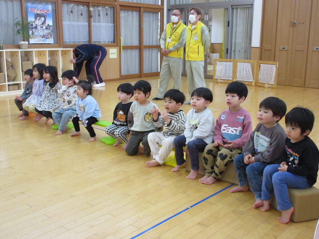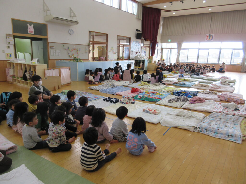 地震の時に大切な「頭を守るだんごむしポーズ」もしっかりと覚えており、揺れが収まった後の「集まって」の掛け声ではあっという間に集まれました。
