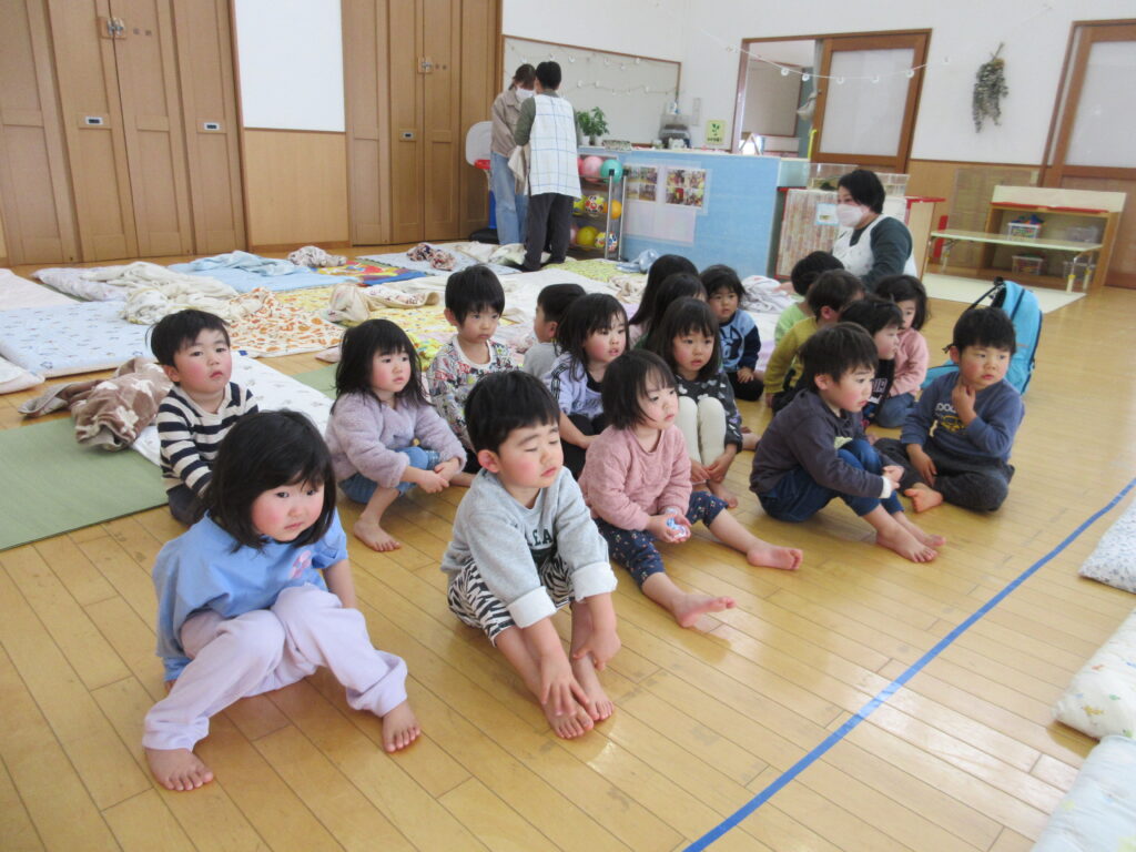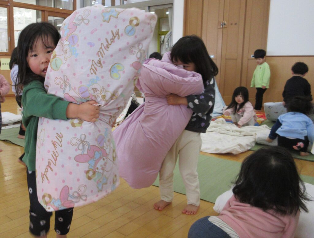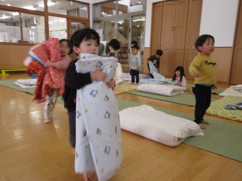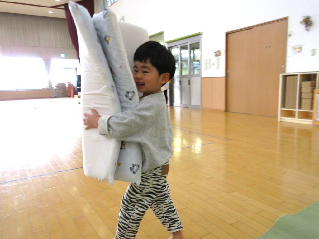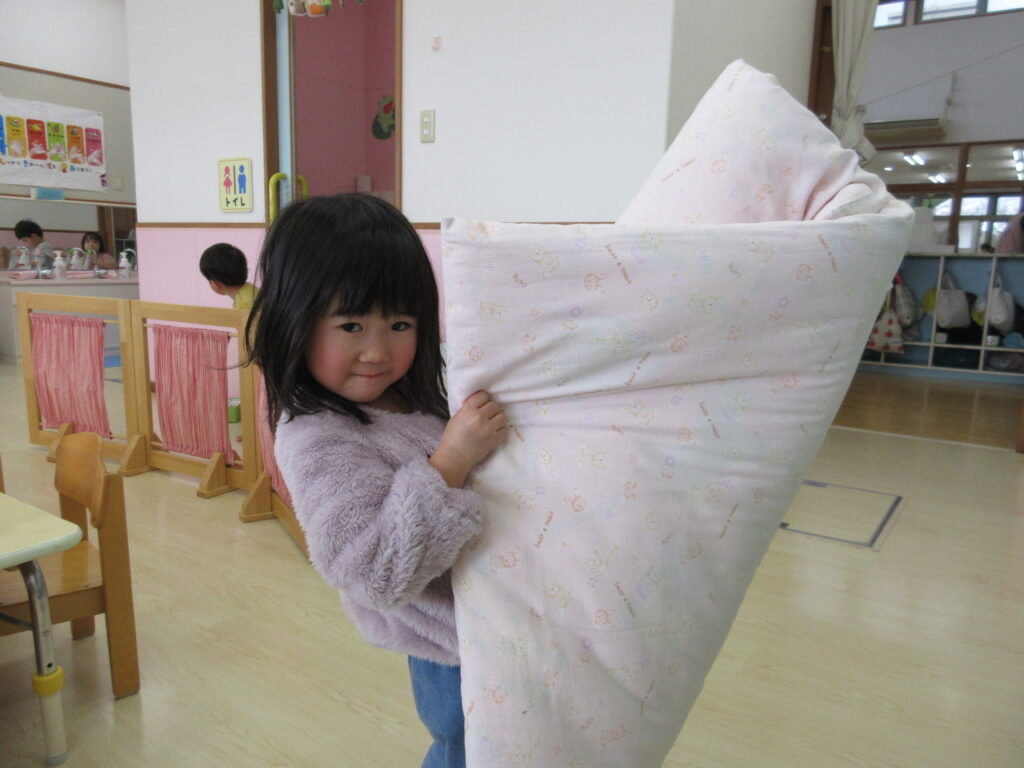 「にじ(年少)さんみたいだね✨」が嬉しい子どたちは、お布団を持つパワーもついてきて、最近はお布団も自分たちで運んでいます!