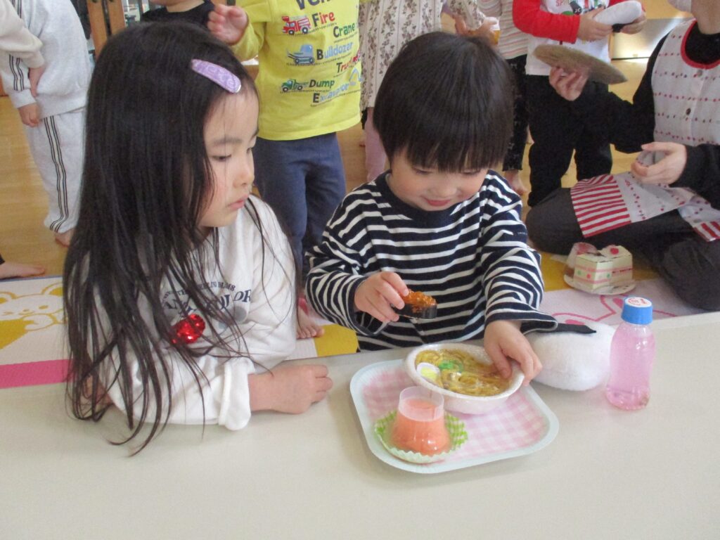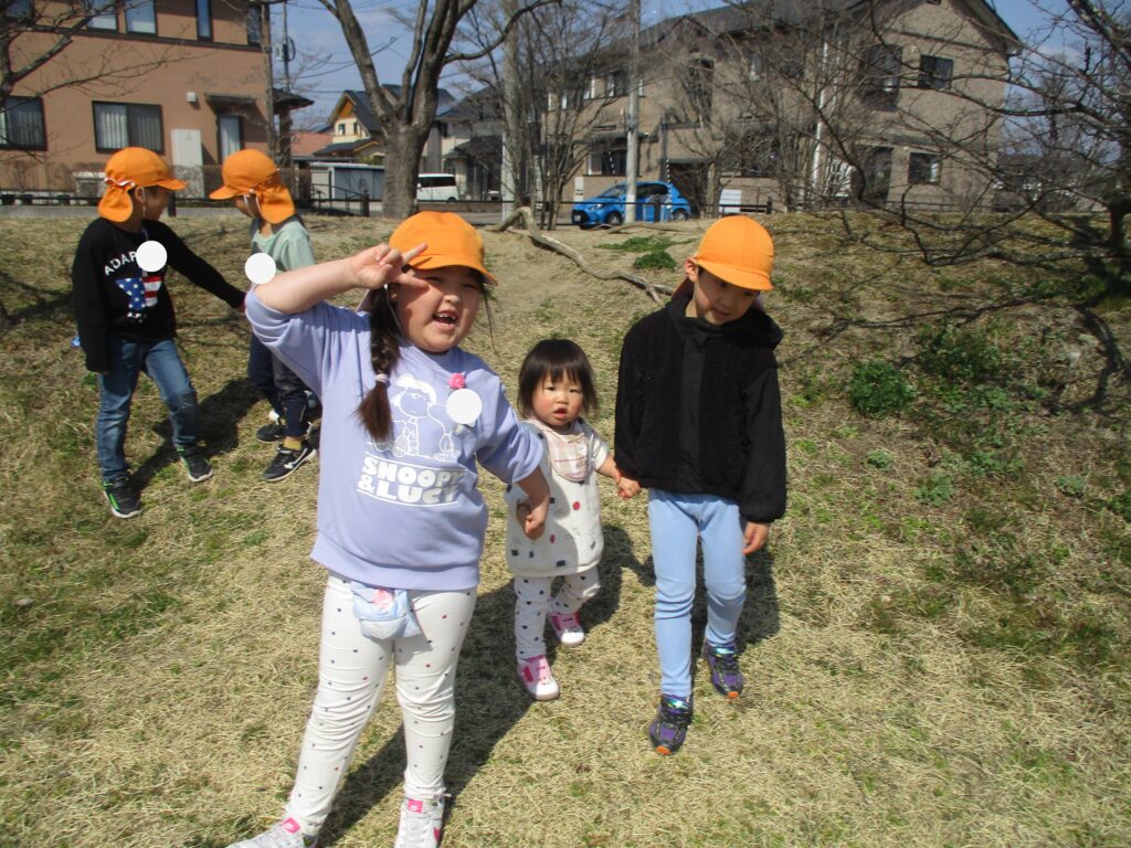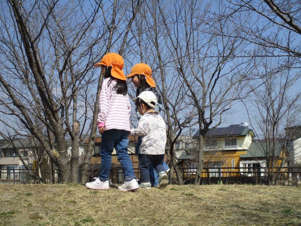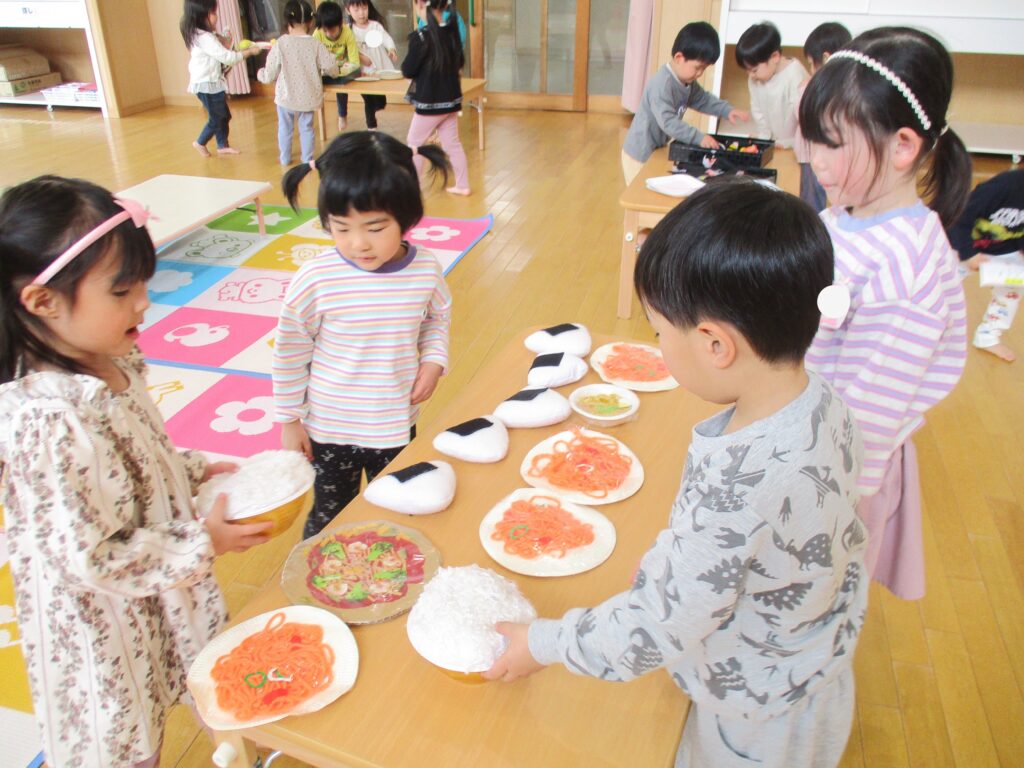 3月はクラスのお友達以外とも一緒に遊ぶ機会が多くありました。ホールでは、「いらっしゃいませ!」「100円ですよ!」とお店屋さんごっこを楽しんだり、「ここにアリさんいるよ!」「木の実だ!何になるのかな」と公園で一緒に春を探して遊ぶ姿が見られました。お兄さんやお姉さん、小さいクラスの友達と楽しい時間を過ごしていました!