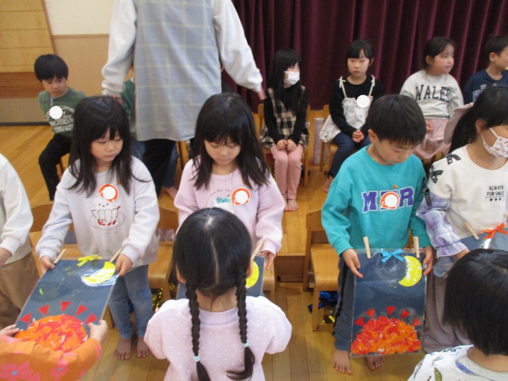 5日には、たいよう組(5歳児)とのお別れ会がありました。たくさん遊んでくれたり、お世話をしてくれたたいよう組のお兄さん・お姉さんへ感謝の気持ちを込めてプレゼントを渡しました。