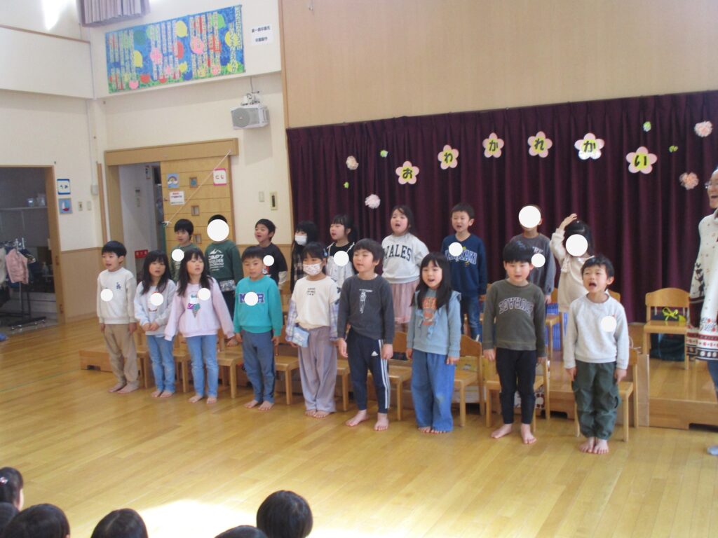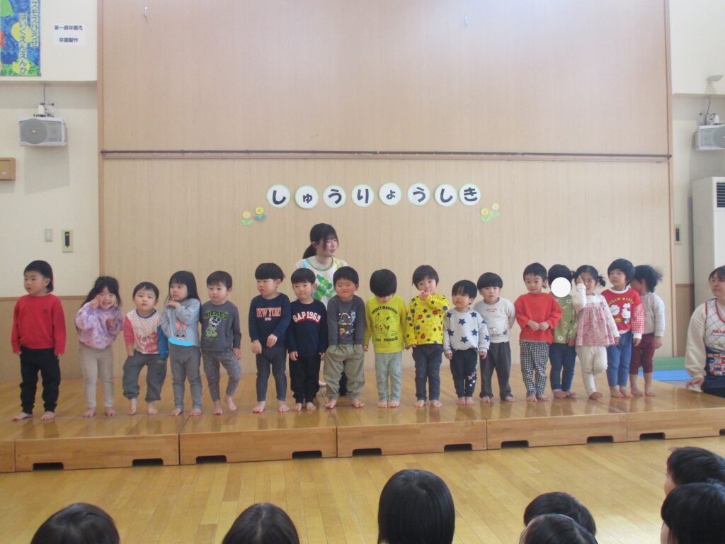 19日は修了式でした。担任から名前を呼ばれ、一年で成長した姿の話がありました。各クラス踊りや歌など、得意なことをステージで披露し園長先生から代表のお友達に一年間で作った作品帳が渡されました。