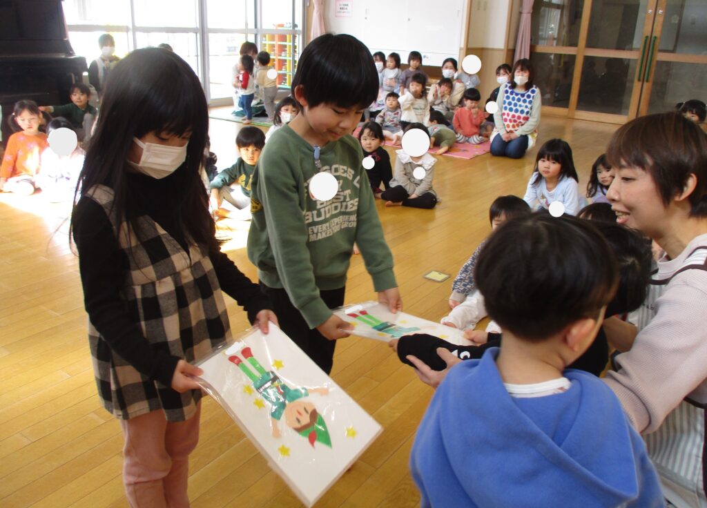 5日には、たいよう組(5歳児)とのお別れ会がありました。たくさん遊んでくれたり、お世話をしてくれたたいよう組のお兄さん・お姉さんへ感謝の気持ちを込めてプレゼントを渡しました。