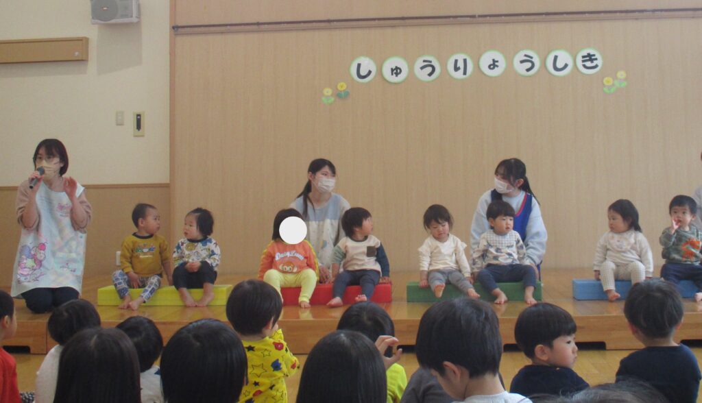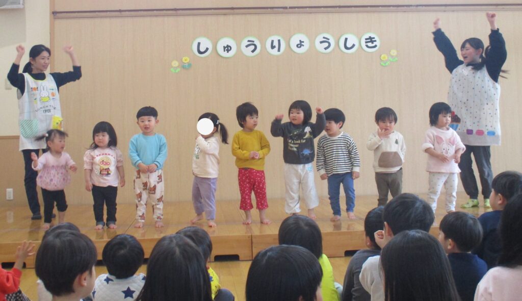 19日は修了式でした。担任から名前を呼ばれ、一年で成長した姿の話がありました。各クラス踊りや歌など、得意なことをステージで披露し園長先生から代表のお友達に一年間で作った作品帳が渡されました。