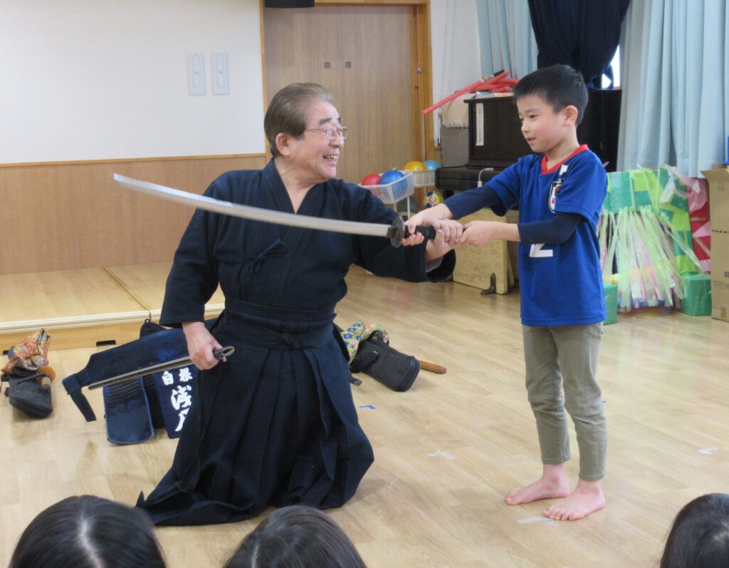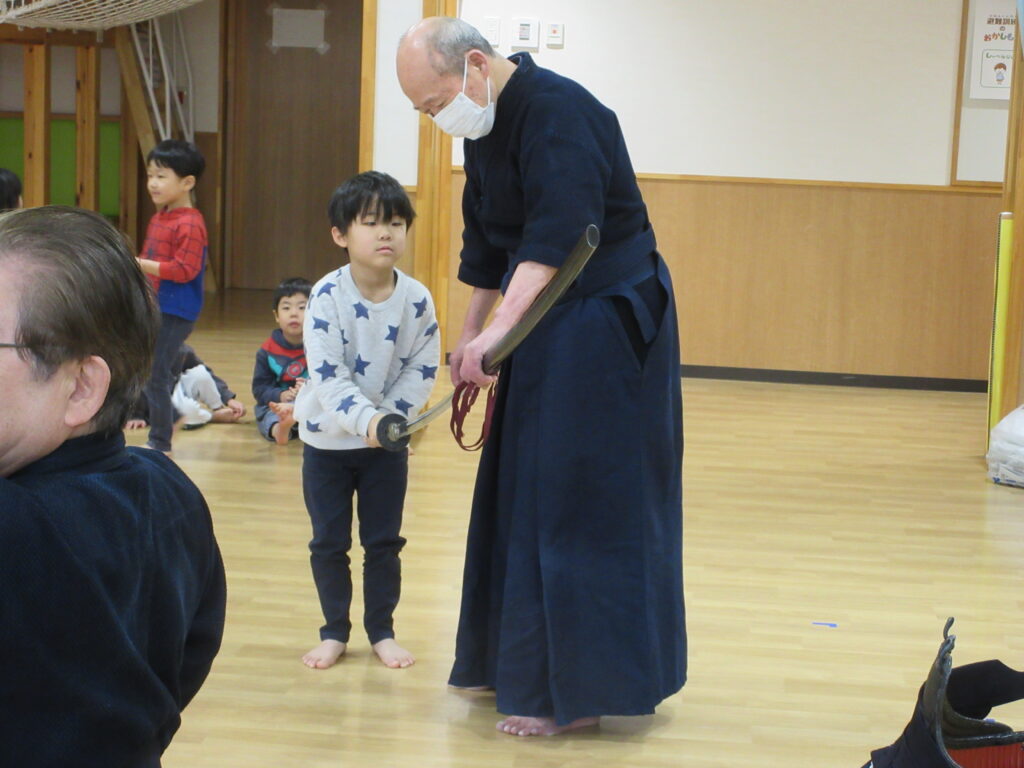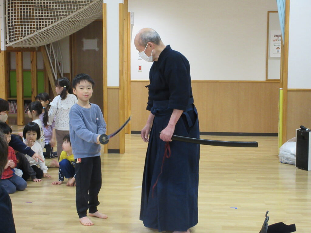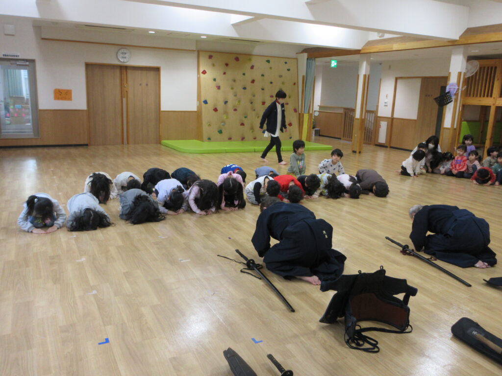 今日は剣道の先生が来てくださり、剣道体験をさせてもらいました。いつもとは違った空気にドキドキする子ども達。まずは座り方、あいさつ、そして返事の仕方を教えてもらうとすぐに吸収する子ども達。さすがたいよう組さんです。