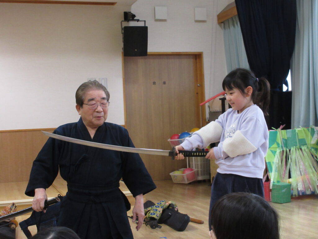 刀で剣道の基本の型を見せてもらいます。時代劇みたい・・・みんな見入っていました。