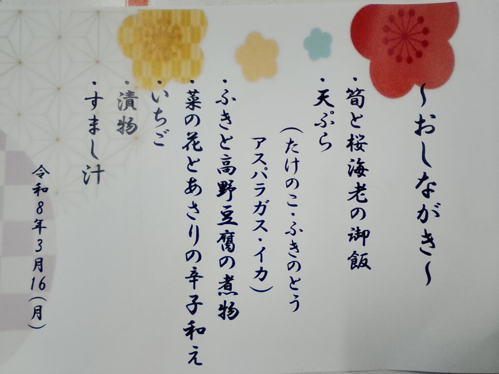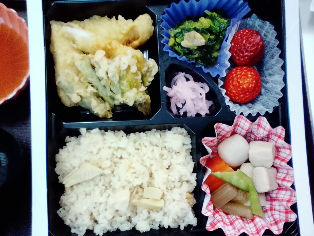 ふたを開けると、彩り豊かな春の食材が並び、皆さまから「わあ、きれい!」「🌸春🌸らしくていいね」と笑顔がこぼれていました。