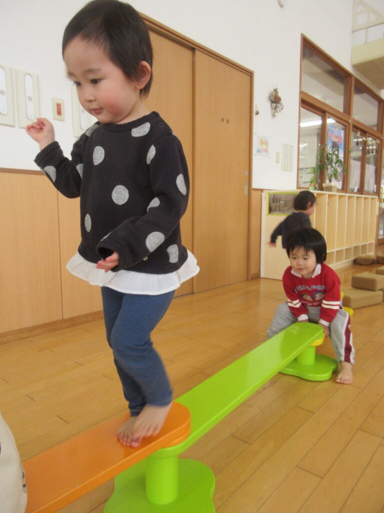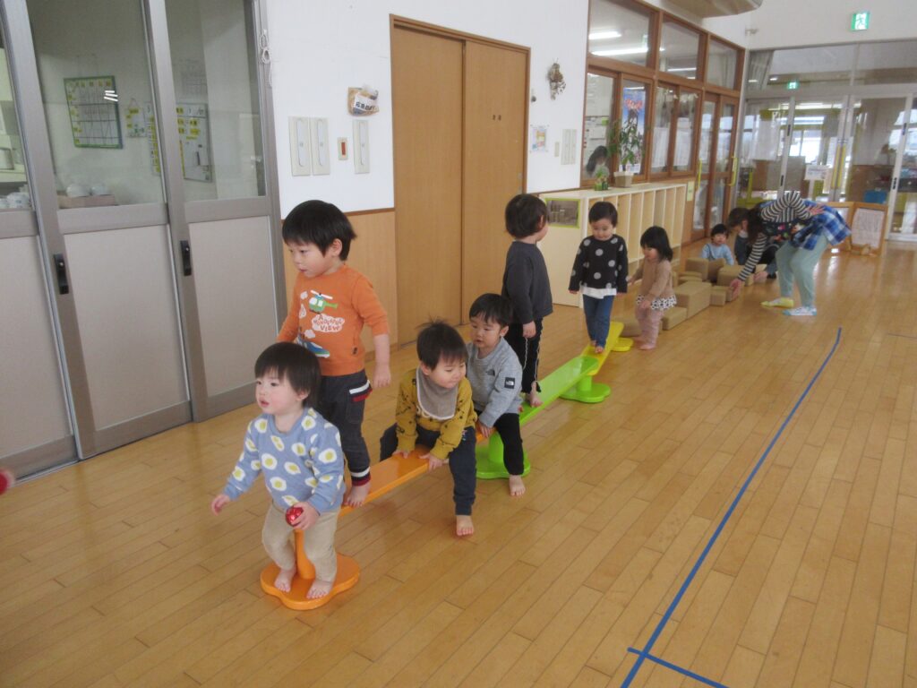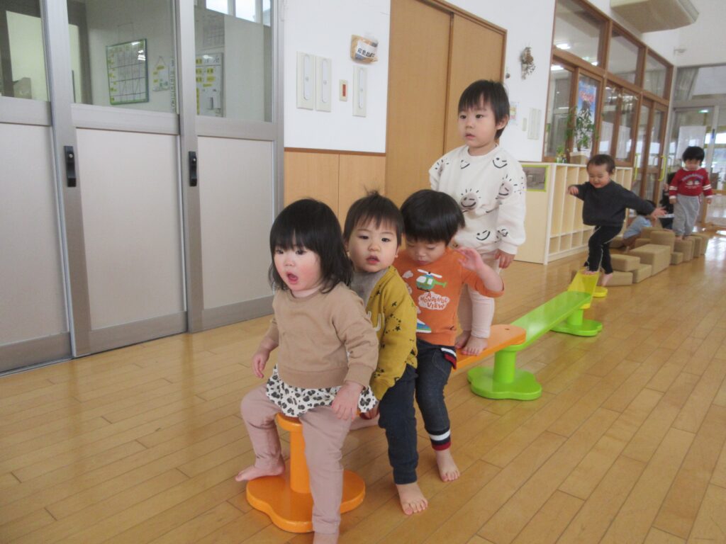 平均台を用意し子どもたちに「これも繋げる?」と聞くと「うん!」とながーい一本道の完成です☺