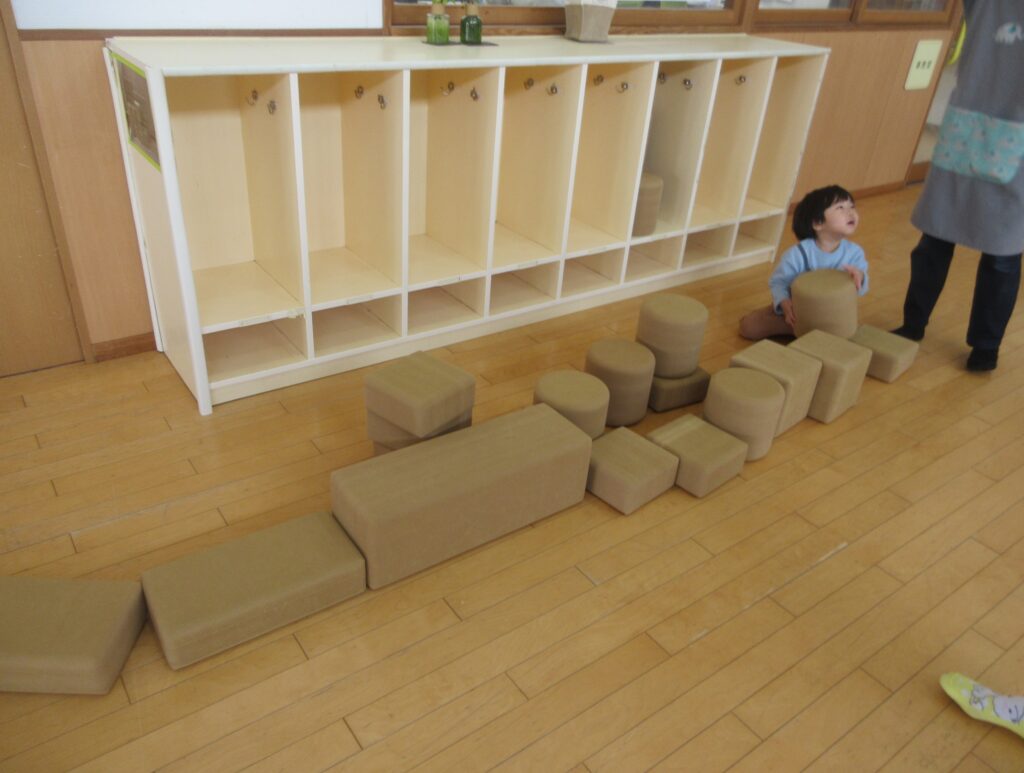 ソフト積み木を使ってタワーを作っている最中にタワーが倒れてしまいました。残念…と思ったら、倒れたソフト積み木を横にきれいに並べて一本道を作り始める子どもたち‼