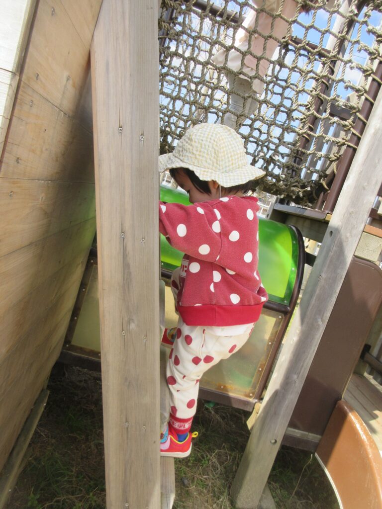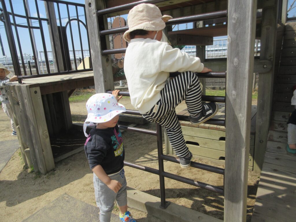 はしごにも興味が出て、お姉さんお兄さんたちが登る姿を見てさっそくまねをする子どもたちです!